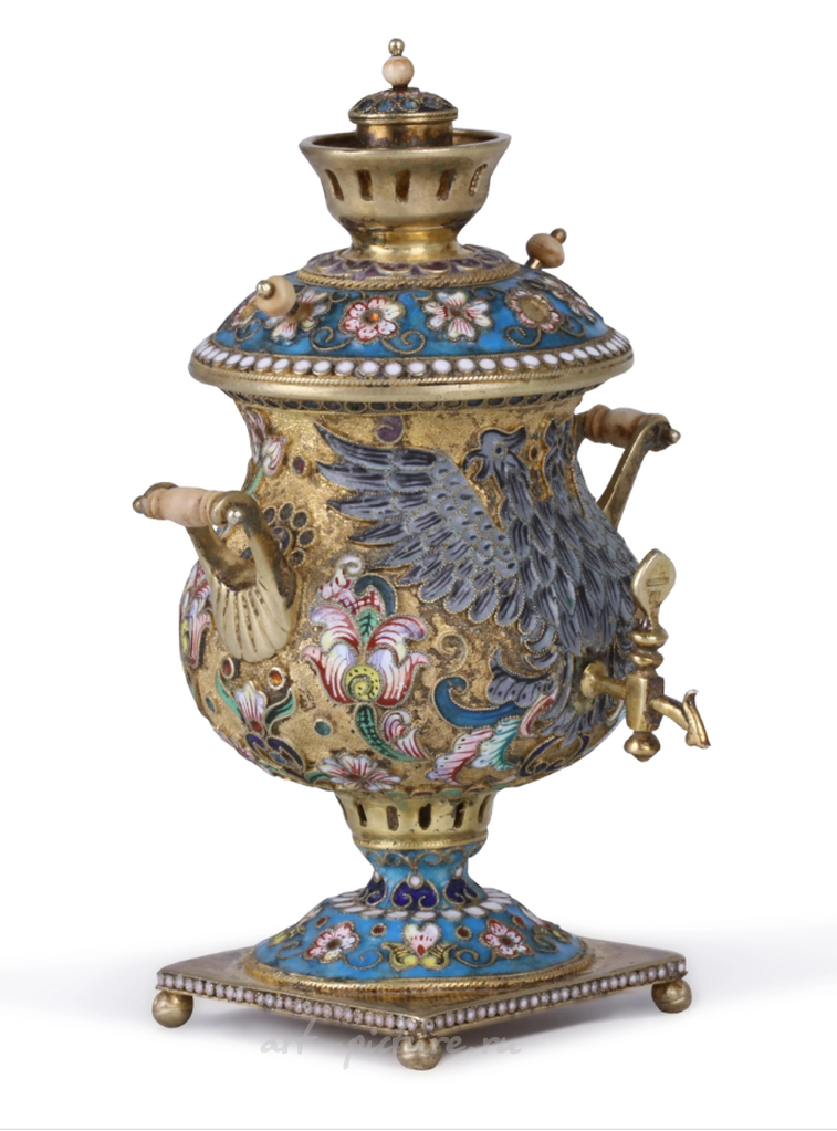 Скульптура также поражает своим декором. Цветочные орнаменты и изображение двуглавого орла, выполненные с использованием перегородчатой эмали, создают впечатление динамики и живости. Эти элементы не только преображают самовар, но и наделяют его глубоким символизмом, отсылающим к традициям русской культуры. Дорогостоящие материалы, такие как серебро и позолота, усиливают ощущение роскоши и значимости данного предмета.