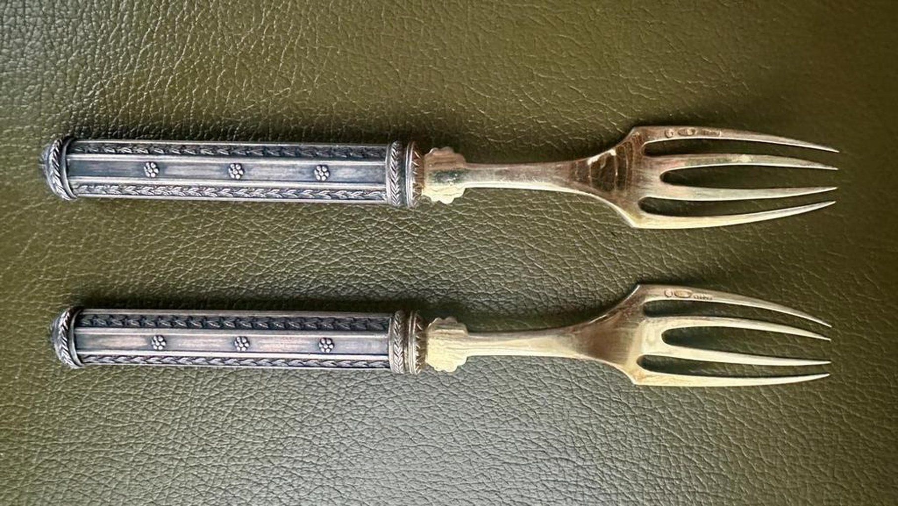 Kомплект вилок, серебро, 2 шт., 84 проба, общий вес изделий 123, 18.2 см, торговый дом фабрики "Болин", 1896-1907 г., Москва, Российская империя Пара вилок фабрики Болин. Есть в истории русского ювелирного дела имена, навечно вписанные в историю искусства. Таковым является Карл Болин. Фирма "Болин" занимает особое место в истории русского ювелирного искусства. Она была создана в конце XVIII столетия в Петербурге. С 1839 г. Карл Эдуард Болин - придворный ювелир, с 1851 г. - оценщик Кабинета, в 1862 г. ему присваивается звание потомственного почетного гражданина. Предмет уникальный, музейного достоинства! Фигура сфинкса и другого мифического персонажа выполнены на очень высоком художественным уровне. Предмет богато декорирован гирляндами, цветами жемчужника, остролистами, родная двухцветная позолота. Состояние превосходное! Шедевр! Длина: 18 см. Вес: 123 гр. Пробирное клеймо «Женская голова в кокошнике в профиль, направленная вправо» в овальном щитке = удостоверяет, что изделие изготовлено и апробировано в России в период с 1908г по 1917г. Литера греческого алфавита «Дельта», сопровождающая пробирное клеймо в одном контуре = устанавливает, что изделие было апробировано Московским пробирным округом, в состав которого входили Нижегородский Губернский пробирер и Тульский Губернский пробирер. Пробирное клеймо «Женская голова в кокошнике в профиль, направленная влево» = удостоверяет, что изделие изготовлено в России в период с 1896г по 1908г. Клеймо «84» = золотниковая проба в клейме удостоверяет, что изделие изготовлено из высокопробного серебра. Клеймо «BOLIN» = фирменный именник торгового дома фабрики Болин. На предмете дополнительно проставлены клейма советского периода.