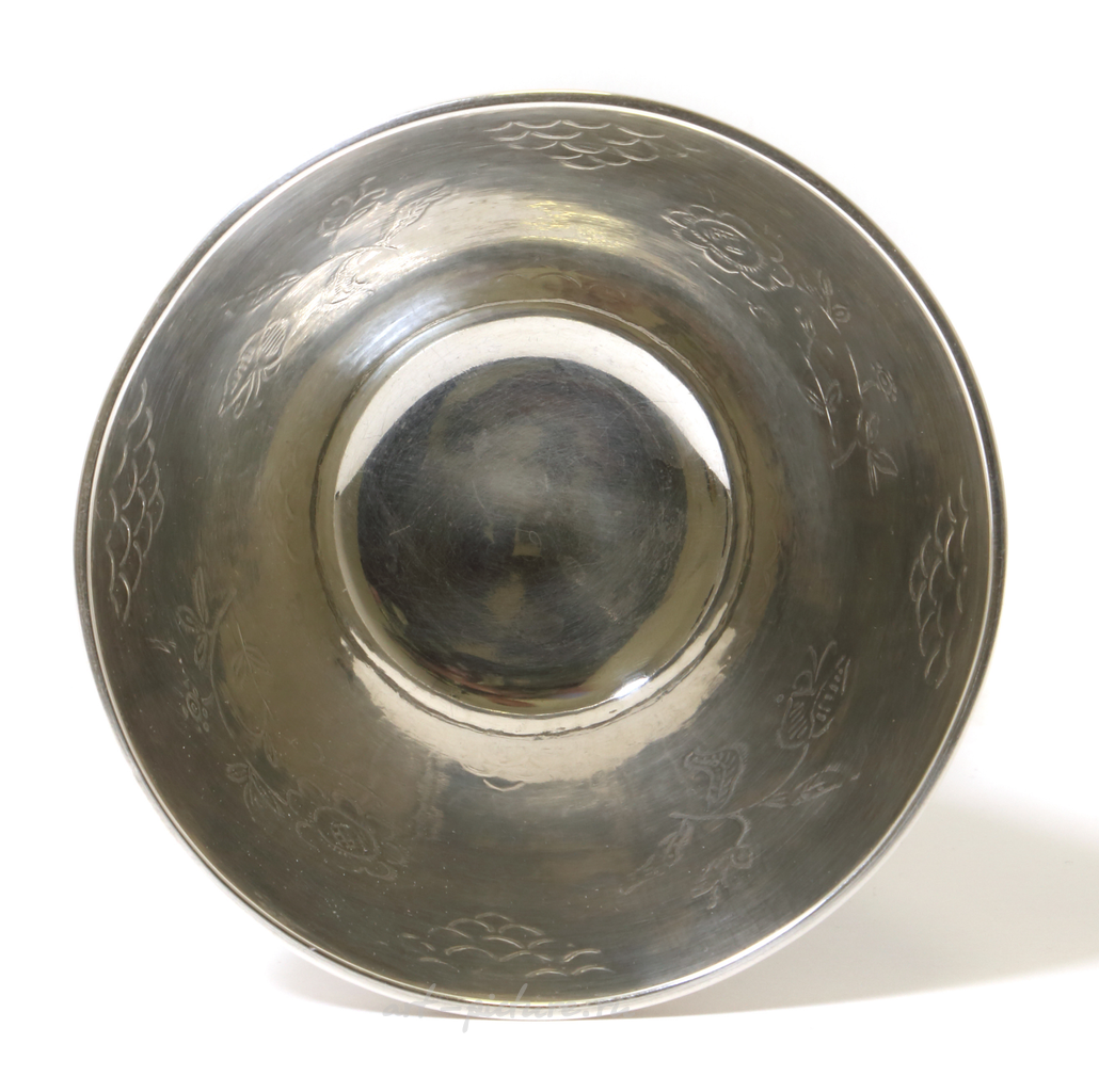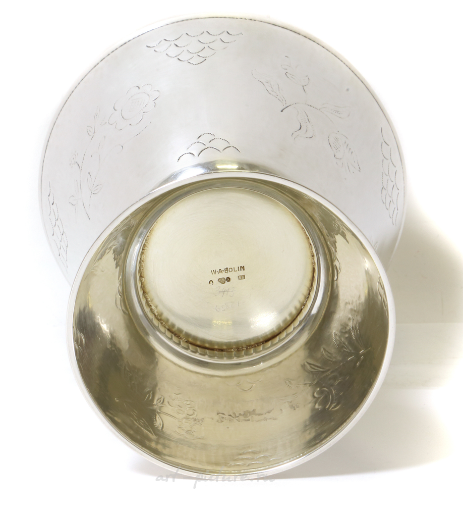 Серебряный кубок или ваза. Швеция, г. Стокгольм, 1928 год, W.A. Bolin - мастерская наследников великого русского ювелира Вильгельма (Василия) Андреевича Болина из знаменитой династии потомственных придворных поставщиков Российской Империи, иммигрировавших в начале ХХ века в Швецию. Высота: 13,5 см, диаметр верха: 11,5 см. Вес: 190 граммов серебра 830 пробы. Silver goblet or vase. Sweden, Stockholm, year 1928, workshop W.A. Bolin. Height: 13.5 cm, diameter of the top: 11.5 cm. Weight: 190 grams of silver 830 fineness.