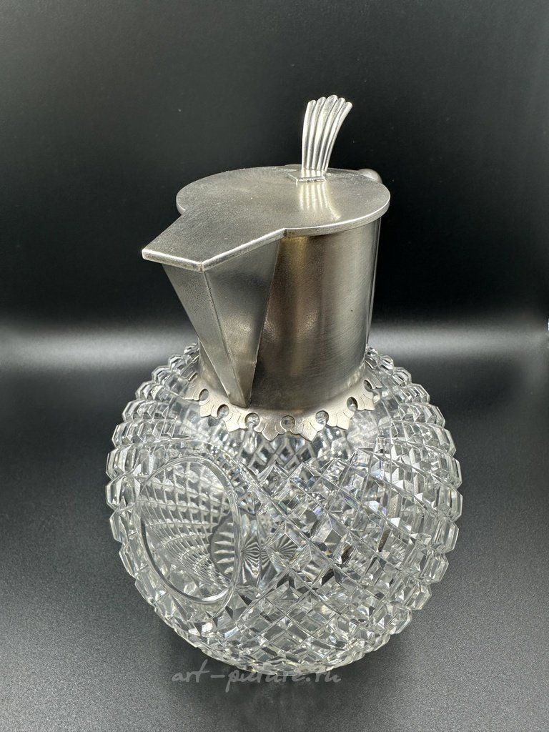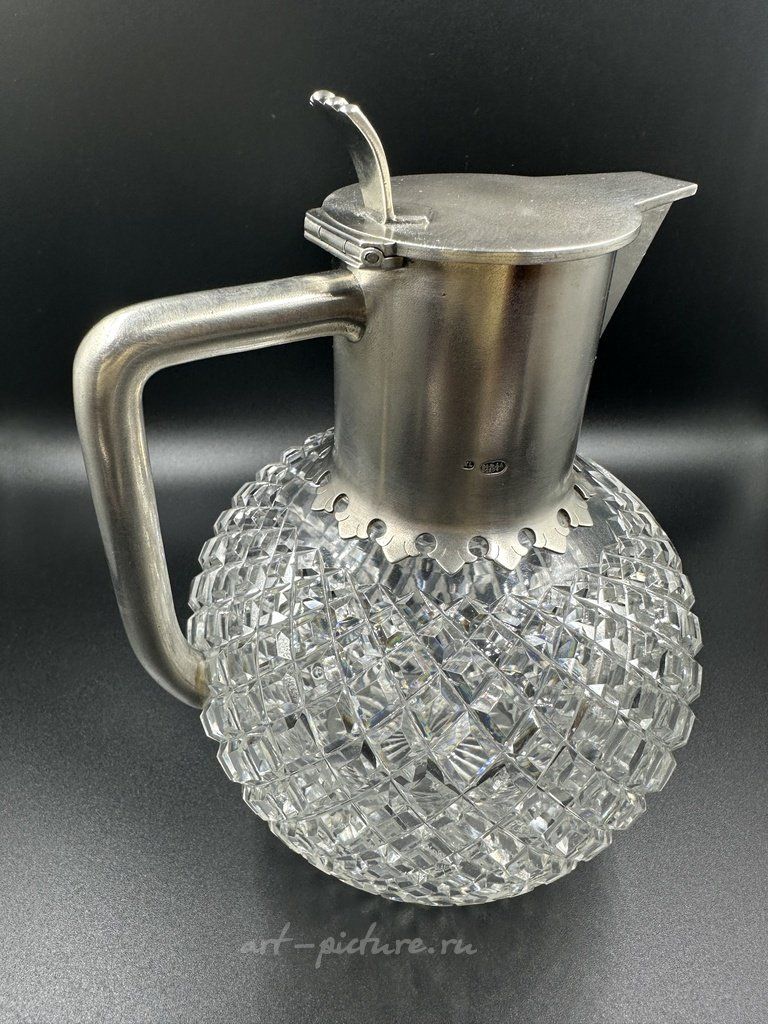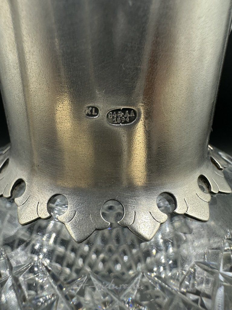 Графин. Хрусталь, серебро 84 пробы. Российская Империя (Россия), г. Москва, 1894 год, фирма BOLIN - Поставщик Двора Его Императорского Величества Российской Империи. Высота: 15,5 см. Клейма: "ML" - клеймо с инициалами Марии Ивановны Линке, владелицы фабрики (мастерской) серебряных изделий (годы работы: 1886-1908), выполняла заказы для фабрики Болина. "Bolin" – клеймо фирмы "Bolin", Поставщика Двора Его Императорского Величества Российской Империи (годы работы: 1866 – 1894). На внутренней стороне крышки двузначное российское пробирное клеймо 1880-х - 1899 гг. - "Георгий Победоносец с цифрой 84", где: "Георгий Победоносец" - клеймо города Москвы; цифра "84" удостоверяет, что изделие выполнено из серебра 84 пробы. Пробирные российские клейма до 1899 года, где: "АА" - инициалы пробирного мастера Арцибашева Анатолия Аполлоновича (годы работы: 1888-1898); цифра "1894" указывает год клеймения; цифра "84" удостоверяет, что изделие выполнено из серебра 84 золотниковой пробы; "Георгий Победоносец" - клеймо города Москвы.