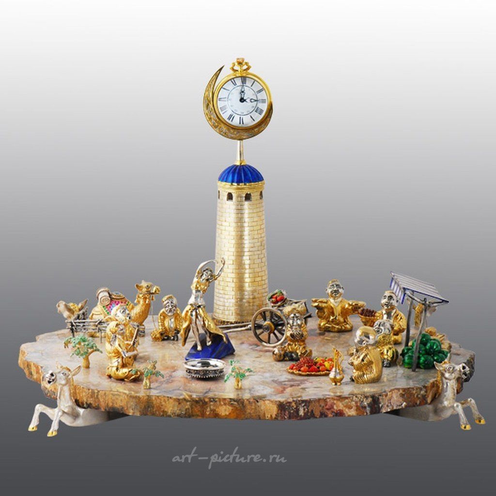 Эта композиция, выполненная из серебра 925 пробы, словно дарует нам возможность прикоснуться к самой сути восточной культуры и традиции, превратив каждую деталь в подлинный шедевр. Башня, увенчанная изысканными часами, украшенная эмалью, сама по себе является настоящим произведением искусства — поразительный цилиндр, что устремляется вверх, словно символизируя мудрость восточных купцов, всегда знающих, когда пришло время деловых встреч, поощряя в нас стремление к тайнам времени и стремительность происходящих событий.