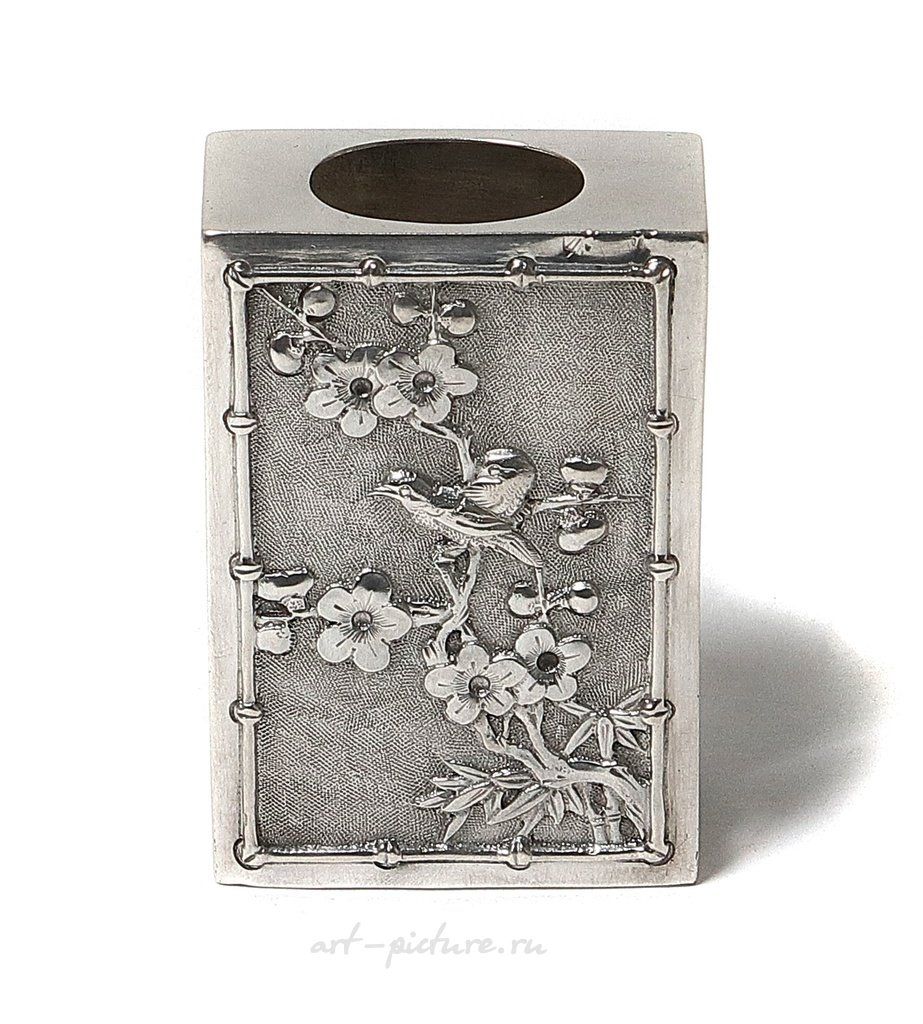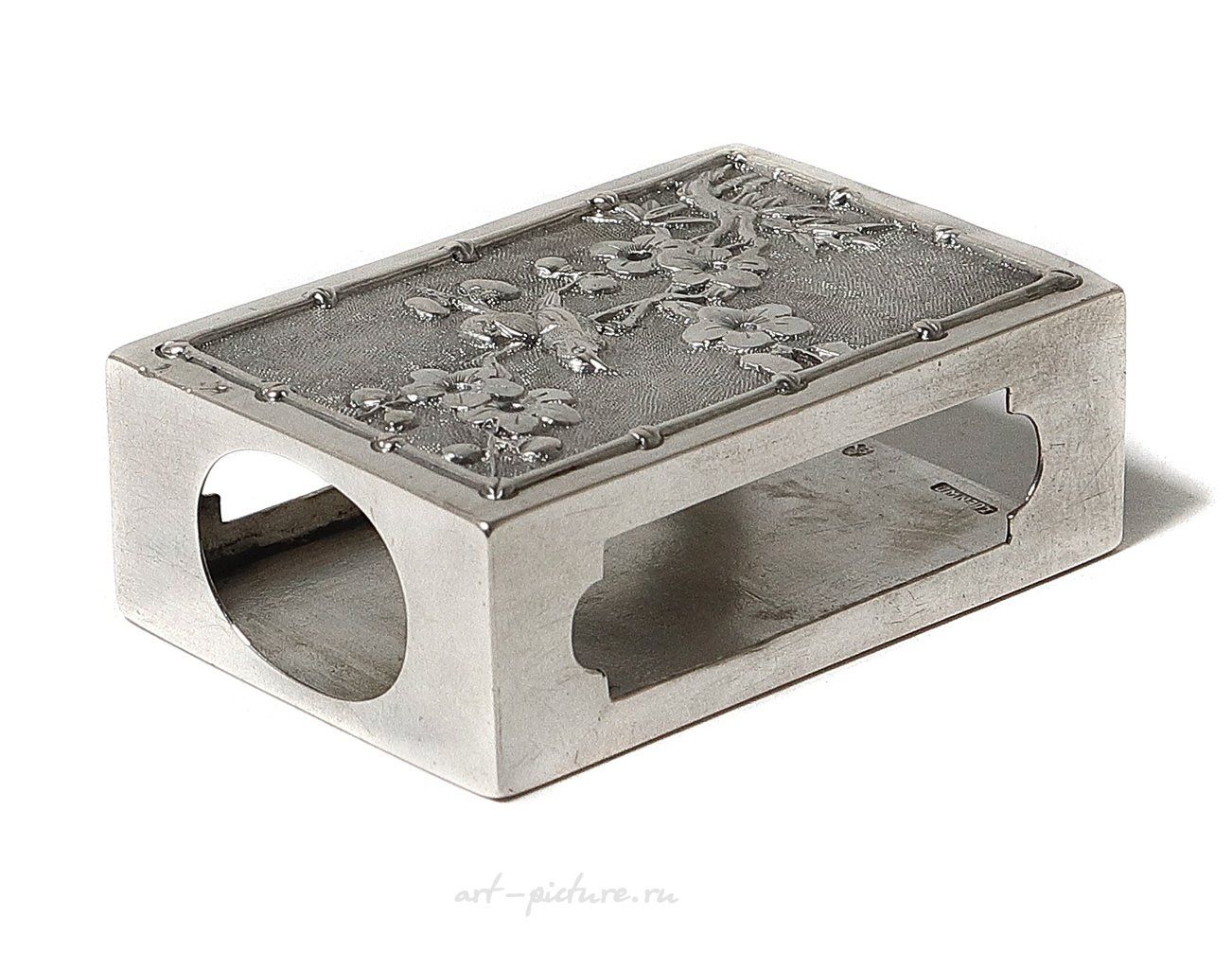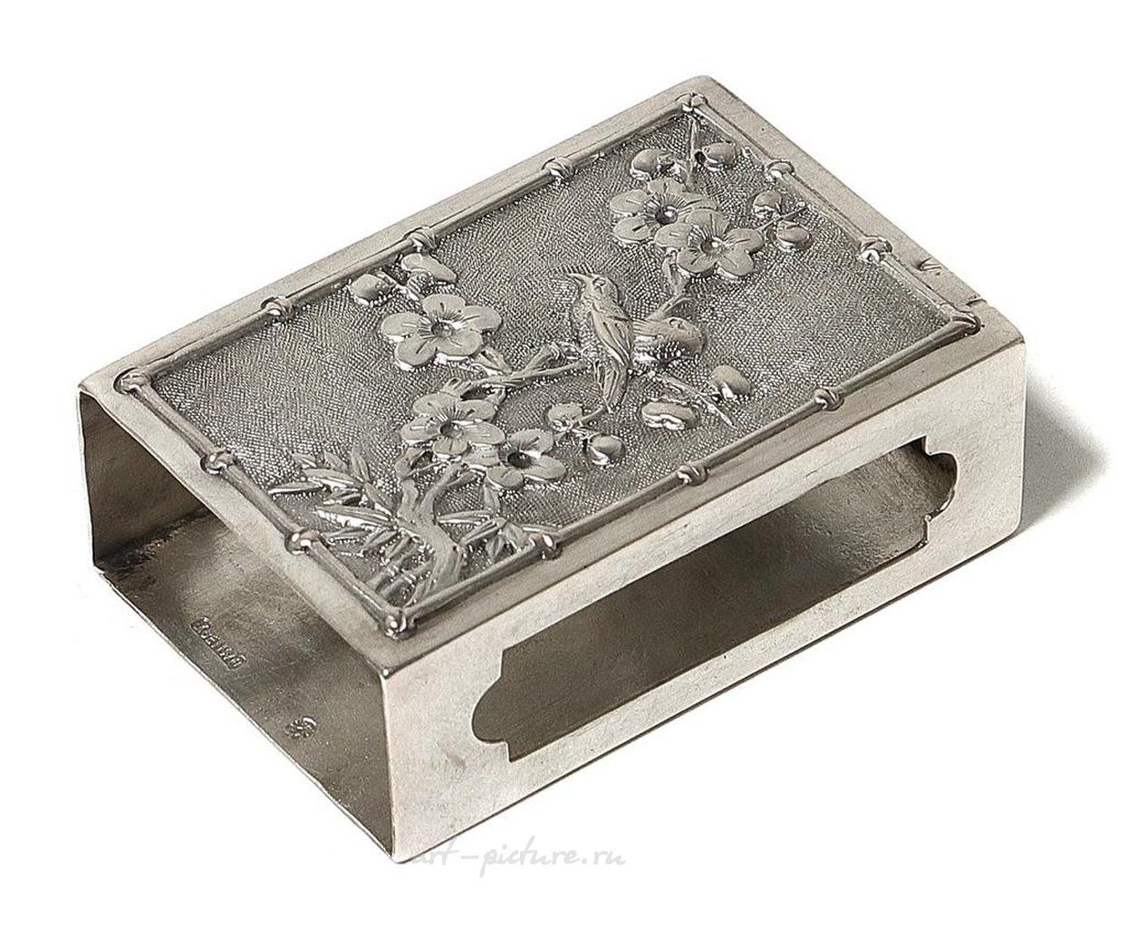 Серебряный бокс для коробка спичек, декорированный птицами сидящими на ветке сакуры. Китай, г. Шанхай,Luen Wo, конец 19 - начало 20 века. Размер: 6 х 4 х 1,9 см. Вес: 37 граммов серебра не ниже 900 пробы. Silver match box holder, decorated with birds sitting on a sakura branch. China, Shanghai, Luen Wo, late 19th - early 20th century. Dimensions: 6 х 4 х 1.9 cm. Weight: 37 grams of silver not less than 900 fineness.