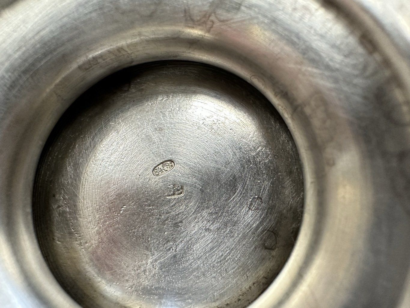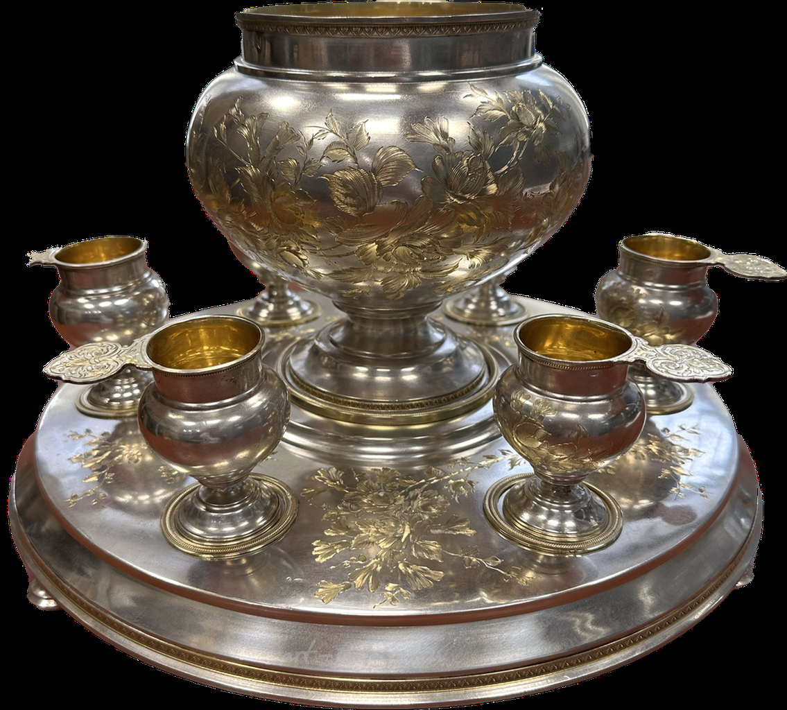 Серебряный набор для крюшона из 8 предметов. Русский модерн. Год: 1899 – 1908 Размер и материал: Серебро, резьба штихелем, гравировка, чеканка, золочение, монтировка; В. братины – 14 см; В. чарки – 7 см; Дм. подноса – 32 см; Общий вес – 1720 г. Состояние: очень хорошее!! Клейма: фирмы – Волганинов Михаил Сергеевич; тройник московского окружного пробирного управления – женская головка в кокошнике, обращенная влево, с инициалами управляющего округом И. Лебедкина – ИЛ и пробой для изделий из серебра – 84. Серебряный набор для крюшона из 8 предметов: Набор представляет собой великолепный образец неорусского стиля конца XIX – начала XX столетия, имеет крупные размеры и отличается подчеркнутым декоративизмом. В центре круглого подноса на ножках, помещена большая братина в виде чугунка на ножке, украшенная искусным цветочным узором, выполненным штихелем. Резным узором штихеля покрыт и поднос. Вокруг братины – 6 чарок с резным узором штихелем на туловах.