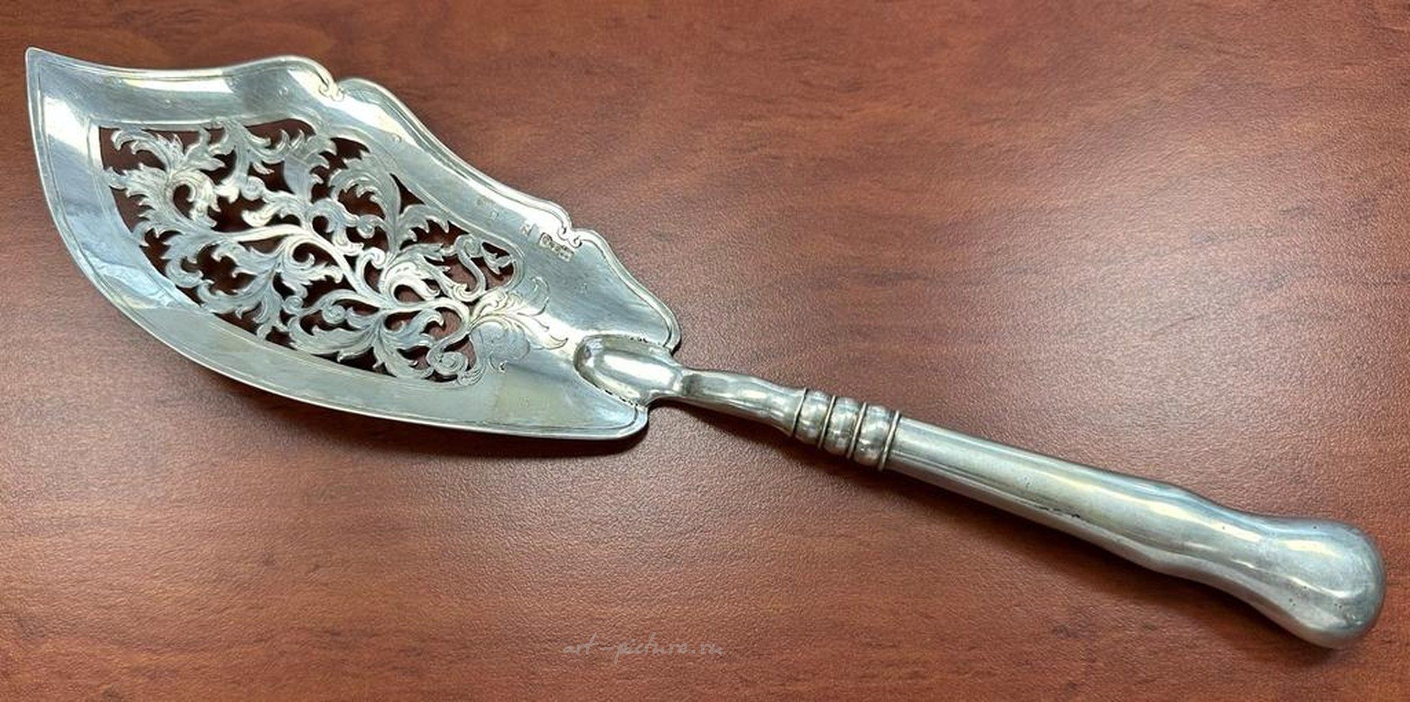 Цельносеребряная сервировочная лопатка для рыбных блюд. Российская Империя (Россия), г. Москва, 1845 год, мастерская Астраханцева Андрея. Длина: 33,5 см. Вес: 209 граммов серебра 84 золотниковой пробы ( = 875 метрической пробе). Клейма: "АА" - клеймо серебряного дела мастера Астраханцева Андрея (годы работы: 1821 - 1845). Пробирные российские клейма 19 века, где: "АК" - инициалы пробирного мастера Ковальского Андрея Антоновича (годы работы: 1821-1856); цифра "1845" указывает год клеймения; цифра "84" удостоверяет, что изделие выполнено из серебра 84 золотниковой пробы; "Георгий Победоносец" - клеймо города Москвы.