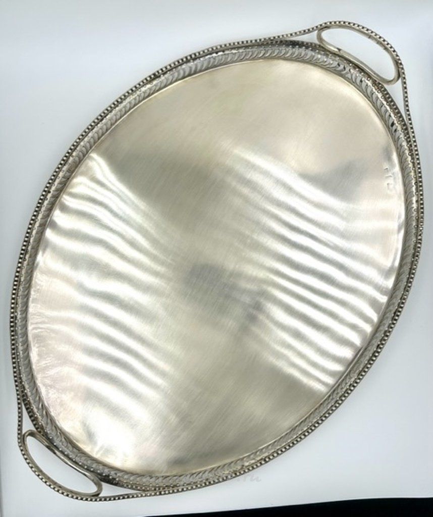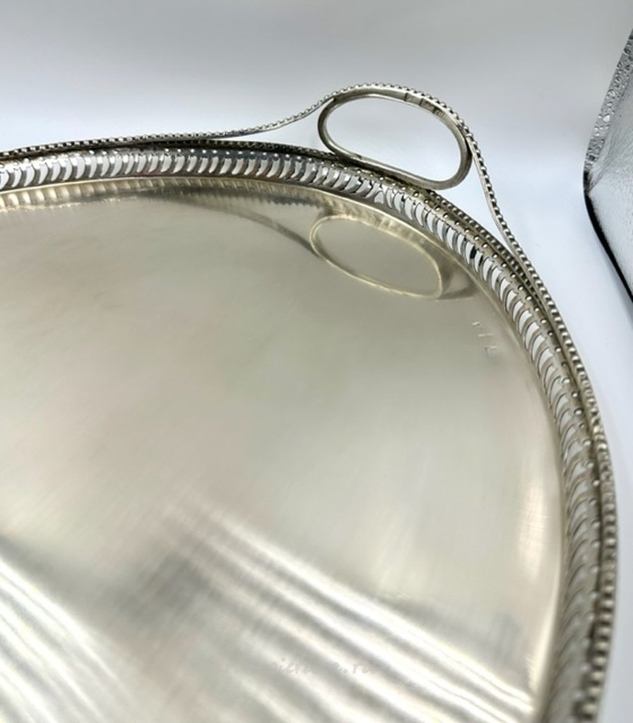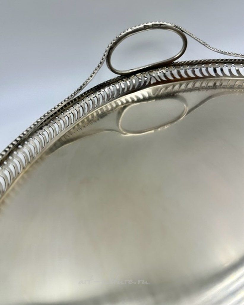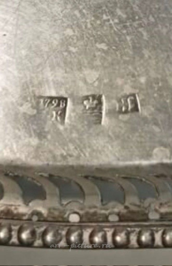 Серебряный поднос в русском стиле 18 века с боковыми ручками 1798 год Калуга Российская империя (Россия), г. Калуга, 1798 год, Максимальные размеры: 40 х 30 см. Вес: 815 грамма серебра 84 золотниковой пробы ( = 875 метрической пробе). Клейма: Пробирное российское клеймо 1798 года, где: Инициалы пробирного мастера НК Красильников Никифор с 1791 (ум. в 1815г.) цифра "1798" указывает год клеймения; "императорская корона над двумя волнистыми полосами", означающими реку Оку" - клеймо города Калуга, (утверждено в 1777 г.) На ручках подноса имеется клеймо "императорская корона над двумя волнистыми полосами" и цифра 84", которое дополнительно удостоверяет, что изделие произведено в г. Калуге из серебра 84 пробы. Также имеется клеймо с инициалами мастера. Silver tray with side handles. Russian Empire (Russia), Kaluga, year 1798 Max size: 40 x 30 cm. Weight: 815 grams of silver 84 fineness in zolotniki ( = 875 metrical fineness). Marks: The Russian hallmarks until 1798, where: Initials of the assay master; "1798" - year of assay; "84" – the fineness mark (84 zolotniks = 875); On the handles of the tray of there is a mark "two anchors, laid crosswise and scepter" and the number 84 ", There is also a makr with the master's initials.