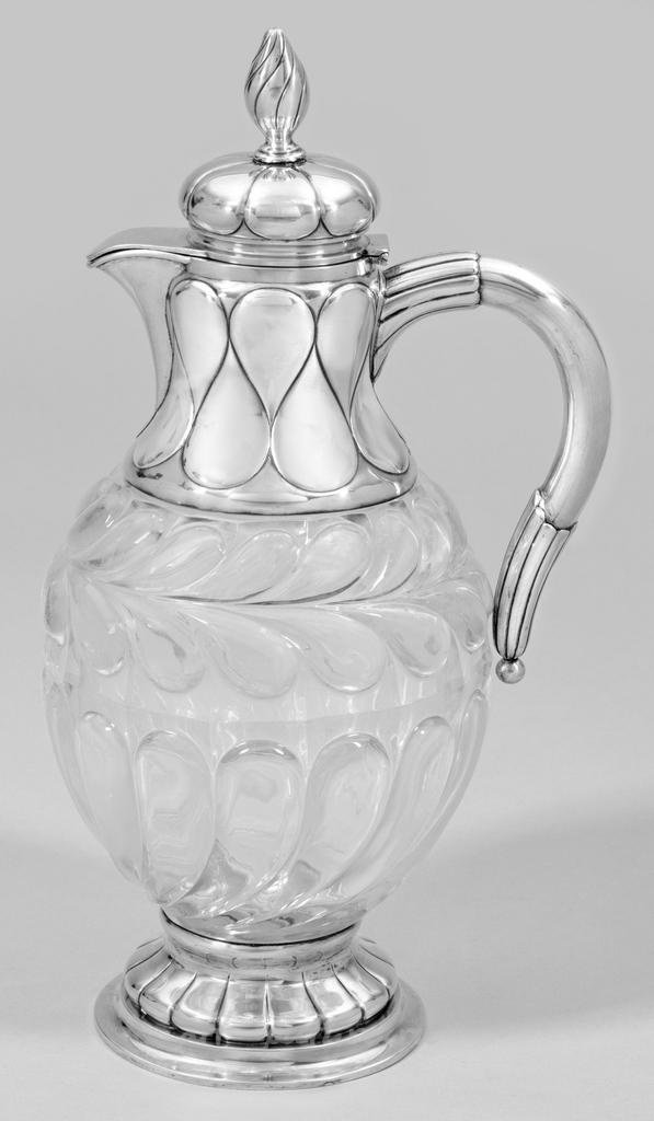 В форме трубы, профилированный, окруженный короткими желобками, переходящий в яйцевидный корпус из полированного бесцветного хрусталя. Поверхность украшена рельефной скульптурой мягкой формы, вертикально и горизонтально расположенным декором в виде рыбьего пузыря. Выполненное по индивидуальному заказу горлышко в серебряной оправе и футляре, окруженное расположенными рядом рыбьими пузырями. Короткий консольный носик с крышкой для носика. Откидная крышка в виде колпачка, увенчанная высокой балясиной в форме сосновой шишки. Высоко посаженная коническая ушная ручка. Ручка, крышка и навершие также украшены частично скрученными линиями с гравировкой. Крепление позолочено с внутренней стороны. Маркировка 84, пробирная марка, дата, клеймо производителя кириллицей с имперским ордером. Нацарапанный инвентарный номер "6652". Высота 30 см. См. Постникова-Лоссева, 1995, № 2022, 2125, 2604, 2607; Каталог Музея гипокультуры, Фаберже, доктор Геза фон Габсбург, Мюнхен, стр. 333. Чрезвычайно редкий графин из русского граненого стекла в серебряной оправе работы Питера-Карла Фаберже. Позолота внутри. Пробирная марка и клеймо производителя с императорским ордером. Датированный. Нацарапанный инвентарный номер "6652". Россия. Москва. Петер-Карл Фаберже, 1895 год.