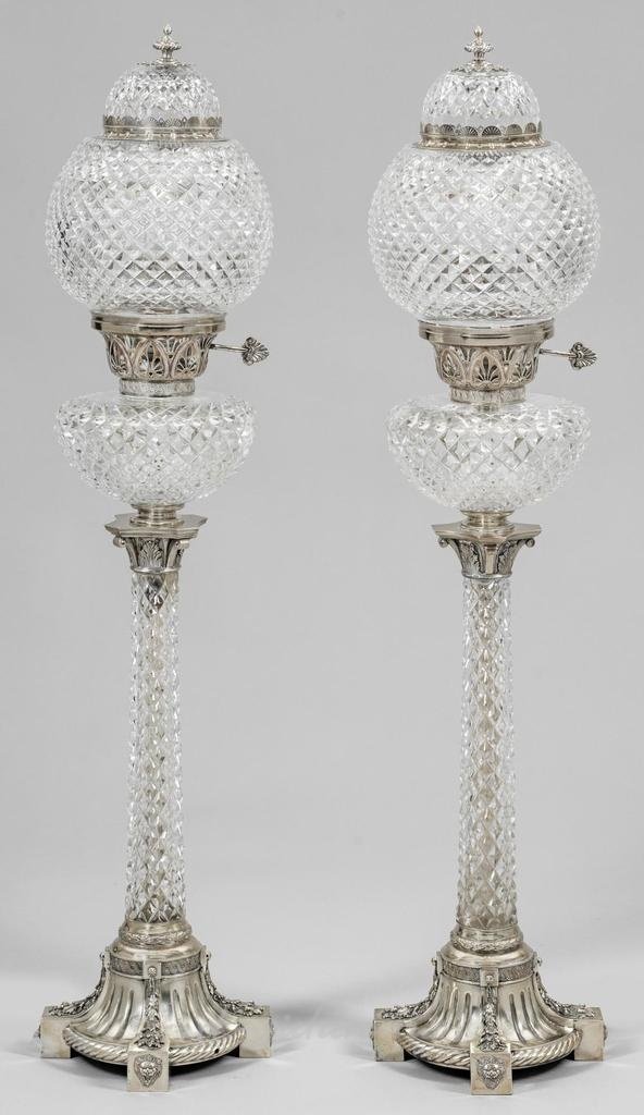 Бесцветное, резное хрустальное стекло с серебряной опорой. Четыре квадратные ножки, украшенные накладными рельефными дубовыми листьями и львиной головой, переходящие в форму трубки на подставках, окруженных желобками и кордированными полосами. Выше на коническом штанге из бесцветного хрустального стекла находится рельефный пластиковый венок из лавровых листьев, украшенный богато резными камнями и гранями, украшенный сложной выточкой и украшенный капителью из серебра с листьями аканта. Выше находится вьющаяся опора с пронзительной работой в форме листа пальмы, которая служит держателем для источника света. Сферический абажур из соответствующего резного хрустального стекла с выпуклой крышкой и завершенный монтированной башмачной ручкой над разделочной розеткой. Электрифицировано. Подписано, удостоверено мастером-ремесленником Олеком Левом Федоровичем (1890-1896), датировано, имеет заводскую марку. В. 81 см. См. Постникова-Лоссева, 1995, № 2022, 2121, 3055. Пара больших и декоративных столовых ламп в стиле российской империи с серебряной опорой и резными хрустальными стеклами. Электрифицировано. Стандартная марка 84, пробирная и пробирный мастерская, марка производителя, датировано. Россия. Москва. Шанкс & Ко. 1895 год.