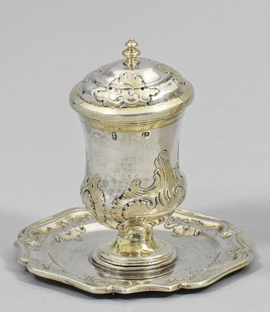 Серебро, частично позолоченное. Профильная, изящно изогнутая подставка с присоединенным вазообразным корпусом на тянутом стебле. Куполообразная крышка. Тарелка, стена и крышка украшены изящной рококо-гравировкой. Позолоченный интерьер. Маркировка, оценка, марка трясучки, мастер Иоганн (Иосиф) Михаэль Беттле (мастер с 1752 года). Вес примерно 90 г. Высота 9 см. См. Селинг, 2007 г., № 2414, БЗ 2390. Маленькая немецкая рококо-покрытая серебряная кружка с позолотой, выполненная Иоганном (Иосифом) Михаэлем Беттле (мастер с 1752 года). Протестировано, оценено и отметка мастера. Немецкий. Аугсбург. 1769-1771 годы.