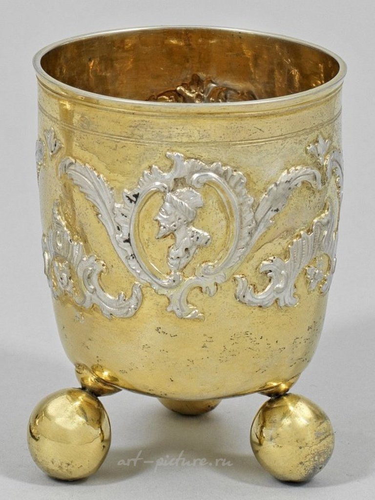 Серебро, частичная позолота. Отдыхает на трех винтовых шаровых ножках, округлое цилиндрическое тело украшено несколько выделяющейся губкой. Поверхность украшена рельефно выполненными рукоятками и листьями аканта, переходящими в три медальона, обрамленные фигурами в форме буквы С, каждый с портретом бюста. Внутренняя часть позолочена. Отмечено дважды неизвестными инициалами "M P B". Высота: 10 см. Вес: 145 г. Сравните с работой Розенберга, том I, номер 1437 (?). Вероятно, это вроцлавский рококо частично позолоченный серебряный бокал. Золоченый внутри. Отмечено дважды неизвестными инициалами "M P B". Вероятно, из Бреслау. Вторая половина 18 века.