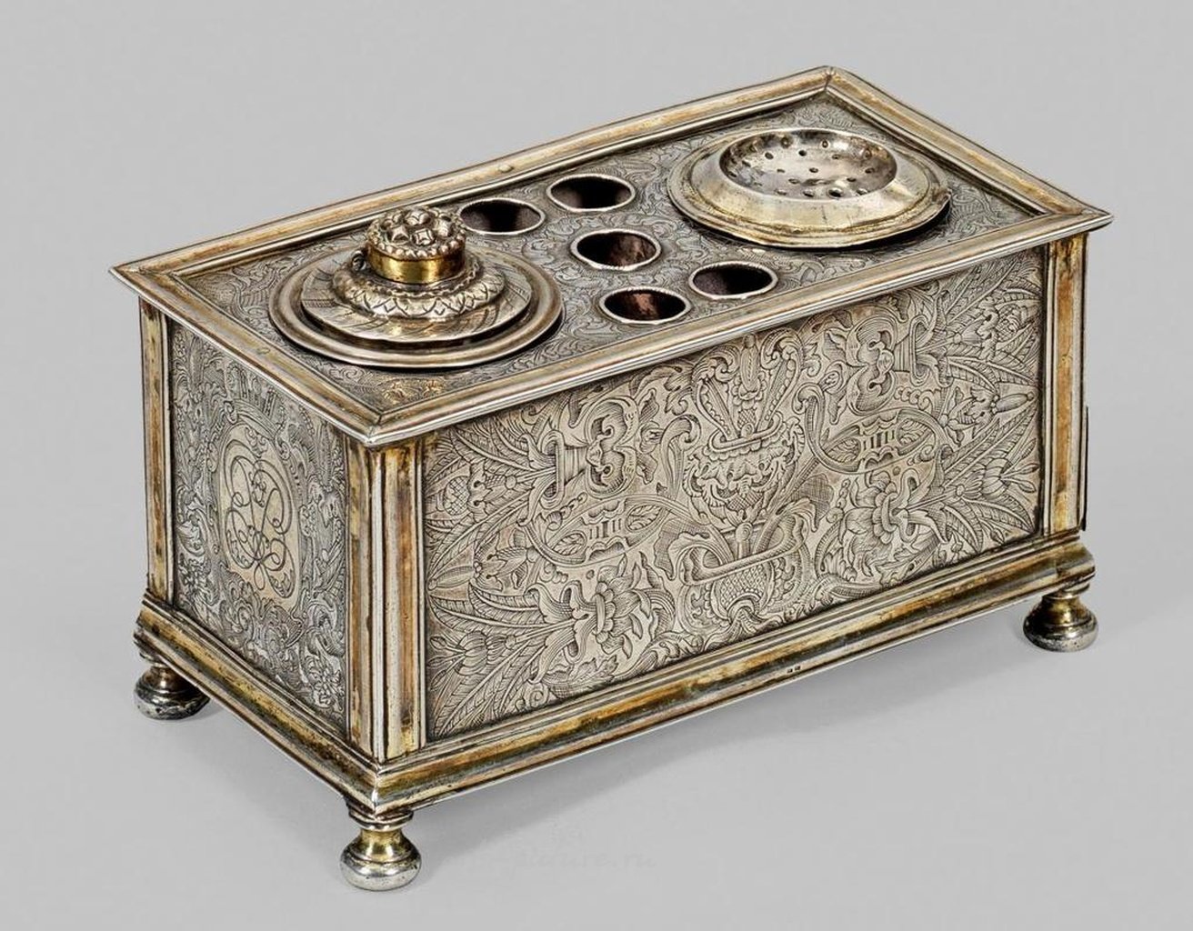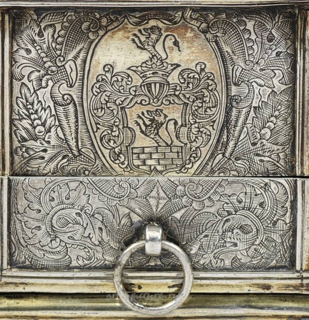 С монограммой царя и императора Петра I Российского (1672 - 1725). Серебро, частично с остаточной позолотой. Прямоугольное тело на четырех ножках. Края и боковые края украшены несколькими профильными декоративными полосами. Боковой ящик непрерывно продолжается с кольцевыми ручками. Верхняя сторона с двумя большими круглыми выемками для чернильницы и песочного пульверизатора, а также пятью меньшими для держателей для перьев. Все стороны покрыты тонкой гравировкой роскошной листвы и завитков, плодов, цветов, раковин и хвостовых орнаментов, а также стилизованных голов орлов сверху. Внизу выгравирована монограмма "FWC" в честь Фридриха Вильгельма, курфюрста Бранденбургского (1620 - 1688). Ящик с старыми указаниями на вес "No: 43M: 5L: 1qt:". На узкой стороне вставлено зеркало с монограммой "PE" (Петр Император) под российской императорской короной Петра I Российского (идентификация монограммы была подтверждена доктором Лопато, куратором работ по серебру в Эрмитаже в Санкт-Петербурге). Аналогичный шифр монограммы можно найти на чертеже триумфальной арки, заказанной Петром I по случаю мирного соглашения с Швецией в 1721 году в Нюштаде. На противоположной стороне выгравированы гербы прусской дворянской семьи фон Ланген - Вильгельм фон Ланген (1706 - 1758) был офицером в русской военной службе с 1737 года. Скорее всего, он получил коробку в качестве награды за военные заслуги от императорского двора. Другая выгравированная монограмма инвентаря "PAB" на нижней стороне, вероятно, означает "Петер Алексеевич Великий" (Петр I Великий). Подписан, отмечен, датирован, старший Моритц Коп (с 1577), мастер Якоб Морес Старший (стал мастером около 1579 года). Вес примерно 780 г. Высота 9,5 см. 16 см x 8,3 см. Якоб Морес I изготавливал высококачественные изделия из серебра от имени европейских королей и князей. Эта коробка также находилась во владении курфюрстов Бранденбурга и королей в Пруссии. Король Фридрих Вильгельм I (1688 - 1740) и царь поддерживали тесные дружеские отношения и оживленный дипломатический обмен. Вероятно, он подарил коробку по случаю коронации царя на троне императора Российской империи в 1721 году. Самый известный подарок Фридриха Вильгельма I - знаменитый Янтарный кабинет.Аналогичная письменная шкатулка из меди можно найти в Летнем дворце Санкт-Петербурга. См. Шлиман, 1985 г., том II, с. 7, № 19, с. 46, № 105, с. 52, № 115; Нойер Зибмахер, том V, Табл. 31 / с. 51; Н.И. Павленко, Петр Великий, Москва 1998 г., с. 64, с. 106, рис. 386; Монограммы на монетах и документах, Фламинг, с. 22, № 686. Серебряная письменная шкатулка Якоба Мореса I (мастер с 1579 года), вероятно, в качестве позднего подарка от курфюрста Фридриха Вильгельма I царю и императору Петру I Российскому (Великому). С остаточной позолотой. Гравированные монограммы, старые весы и герб дворянской семьи фон Ланген. Марка пробы и мастера. Немецкий, Гамбург, около 1580 года.