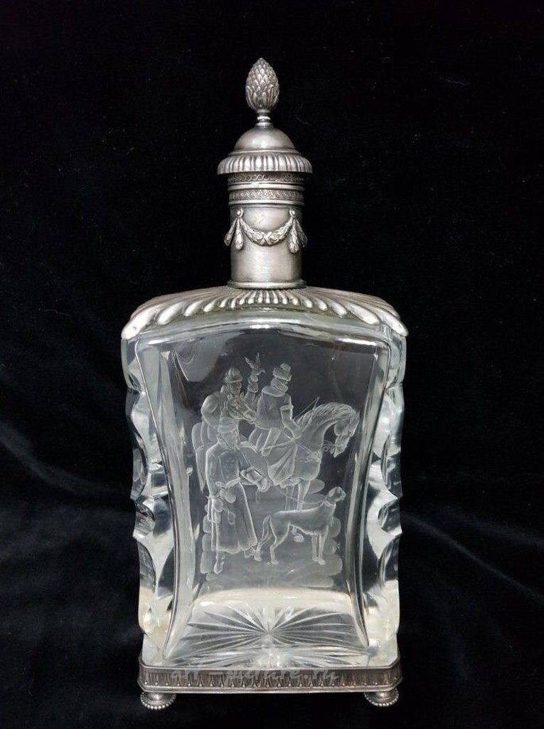 Эксклюзивный штоф "Царская охота". Бесцветный хрусталь отравлен в серебро 925 пробы. Мастер Александр Анискин - ювелир работающий в стиле К. Фаберже. Лимитированный выпуск высота 28 см., объем 600 мл. Подарочная коробка.