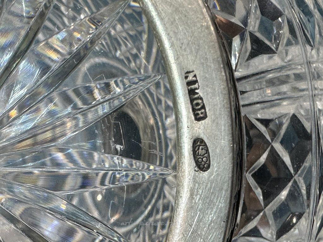 ШТОФ. Хрусталь, серебро 88 пробы. Российская Империя (Россия), г. Москва, 1894 год, фирма BOLIN - Поставщик Двора Его Императорского Величества Российской Империи. Высота: 14,5 см. Клейма: клеймо фирмы "Bolin", Поставщика Двора Его Императорского Величества Российской Империи (годы работы: 1866 – 1894). На внутренней стороне крышки двузначное российское пробирное клеймо 1880-х - 1899 гг. - "Георгий Победоносец с цифрой 88", где: "Георгий Победоносец" - клеймо города Москвы; цифра "88" удостоверяет, что изделие выполнено из серебра 88 пробы. Пробирные российские клейма цифра "88" удостоверяет, что изделие выполнено из серебра 88 золотниковой пробы; "Георгий Победоносец" - клеймо города Москвы.