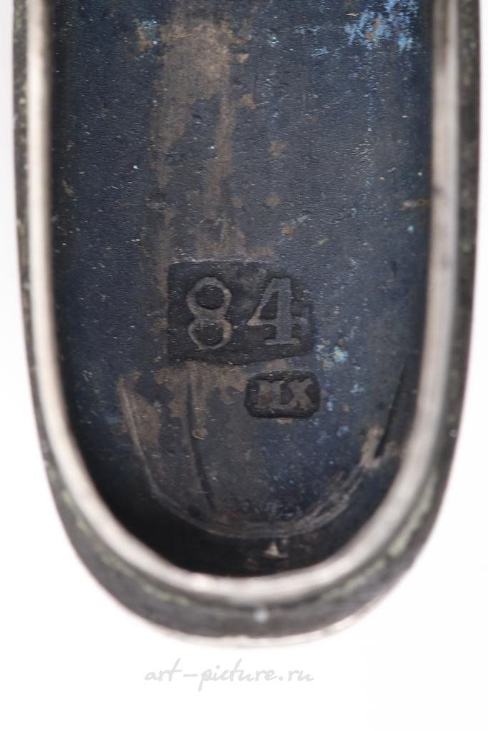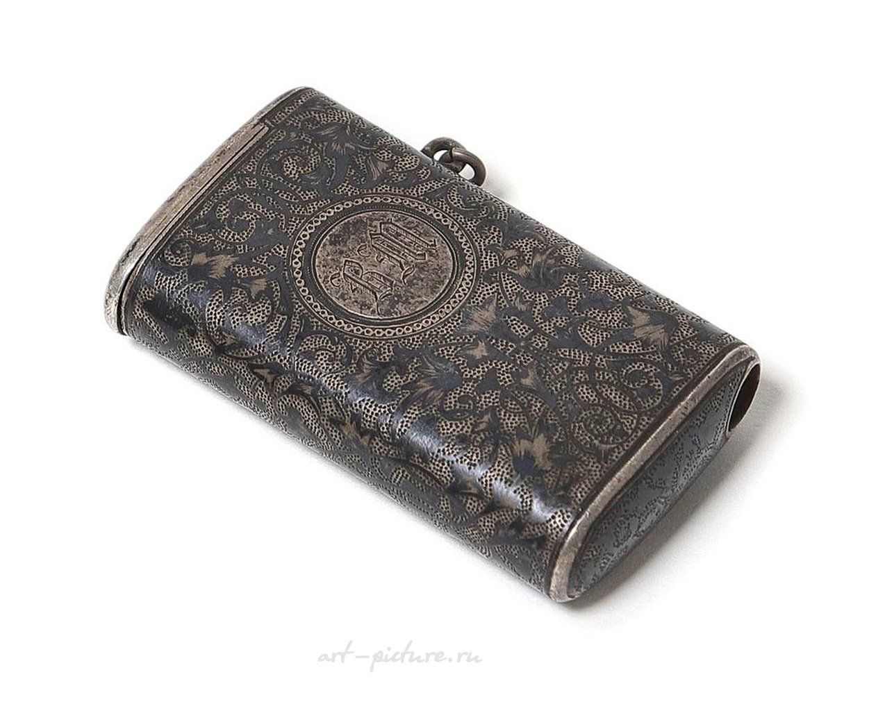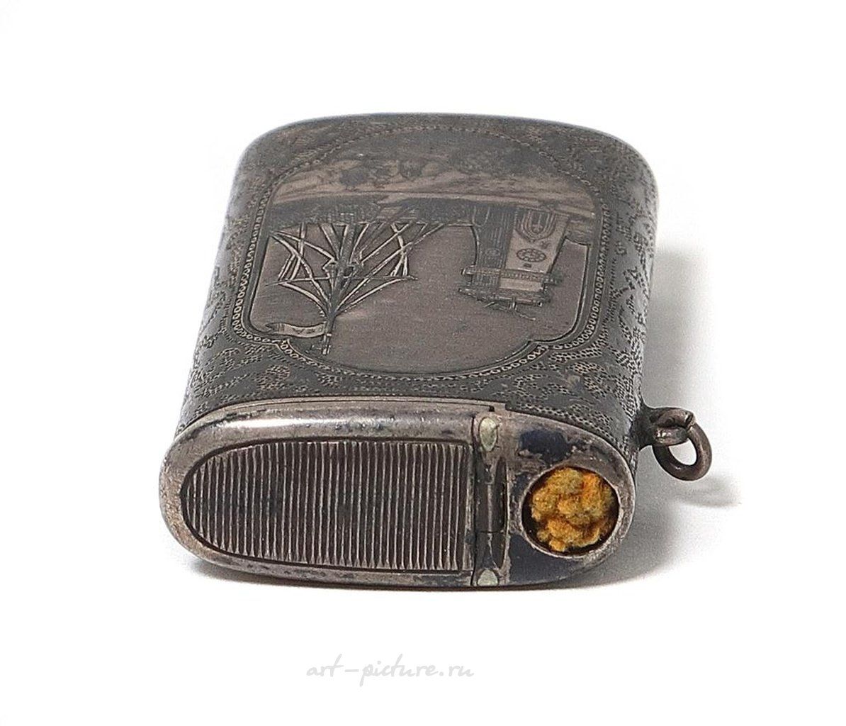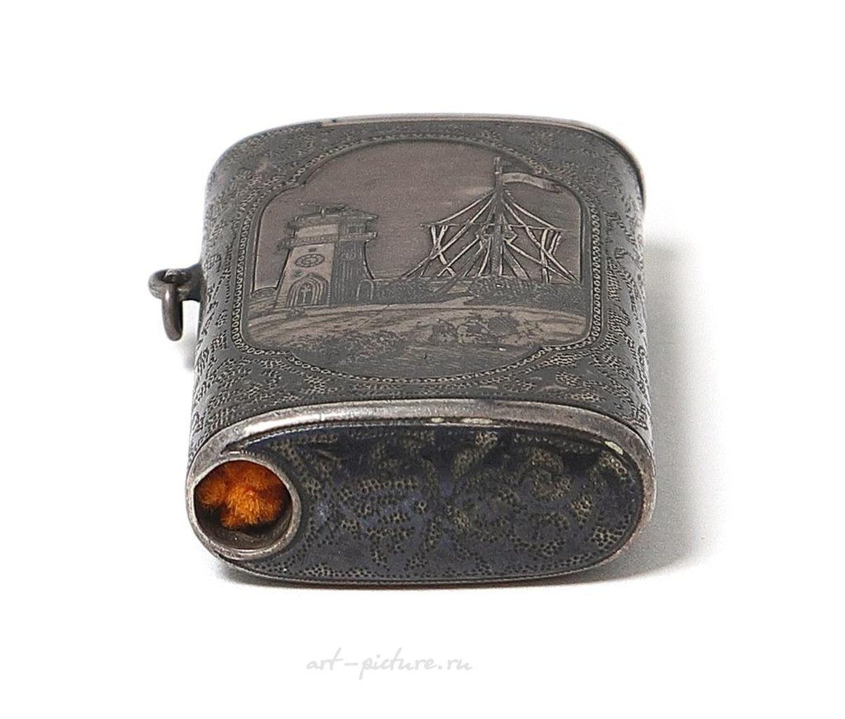 Серебряная спичечница со шнуром для розжига, декорированный черневым рисунком. Российская Империя (Россия), начало 19 века. Размеры: 6 х 3,3 х 1,5 см. Вес: 40 граммов, серебро 84 золотниковой пробы ( = 875 метрической пробе). С монограммой. Клейма: "НХ" - клеймо с инициалами мастера. Цифра "84" удостоверяет, что изделие выполнено из серебра 84 золотниковой пробы. Sterling silver matchbox with ignition cord, decorated with niello drawing. Russian Empire (Russia), early 19th century. Dimensions: 6 x 3.3 x 1.5 cm. Weight: 40 grams, silver of 84 fineness in zolotniki (= 875 metrical fineness). There is monogram. Marks: "НХ" - a mark with the initials of the master. "84" – the fineness mark (84 zolotniks = 875)