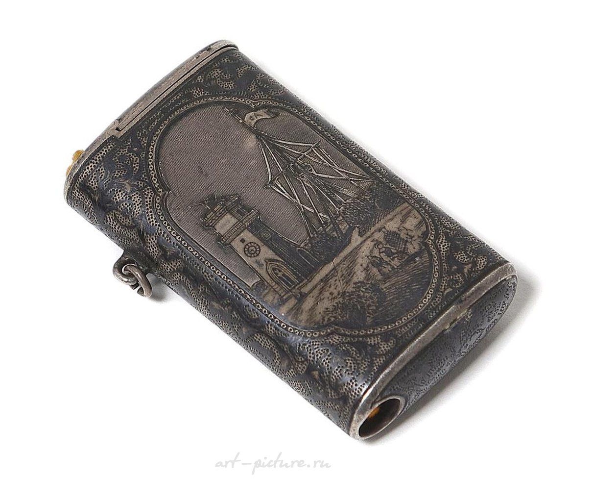 Спичечница выполнена из серебра, и в ней используется чернь — техника, которая всегда меня поражала своей изысканностью. Глядя на её поверхность, я внимаю рельефному узору, который возникает благодаря тёмной лиге, создавая яркий контраст, подчеркивающий каждую деталь. Эффектное изображение башни и парусного судна на фоне сразу же погружает меня в воображаемый мир путешествий и истории. Кто знает, какие истории скрываются за этим маленьким артефактом, в каком доме она находилась, какие воспоминания хранила... Это просто невероятно!