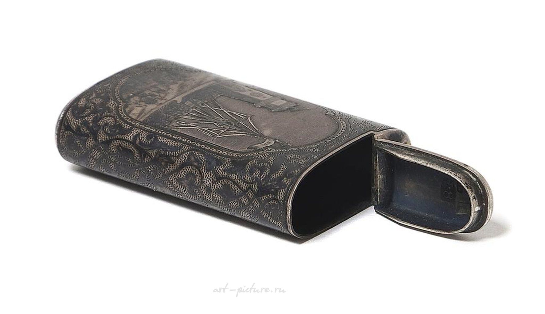 Как только я увидел это потрясающее изделие, меня поразило мастерство и изящество, с которыми его создали. Изготовленная из серебра и украшенная чернью, спичечница сияет как признание художественного гения мастеров того времени. Интересно, как они достигали такого уровня детализации, создавая потрясающие узоры и изображения, такие как башня и парусное судно на фоне? Это не просто предмет, а настоящая икона!