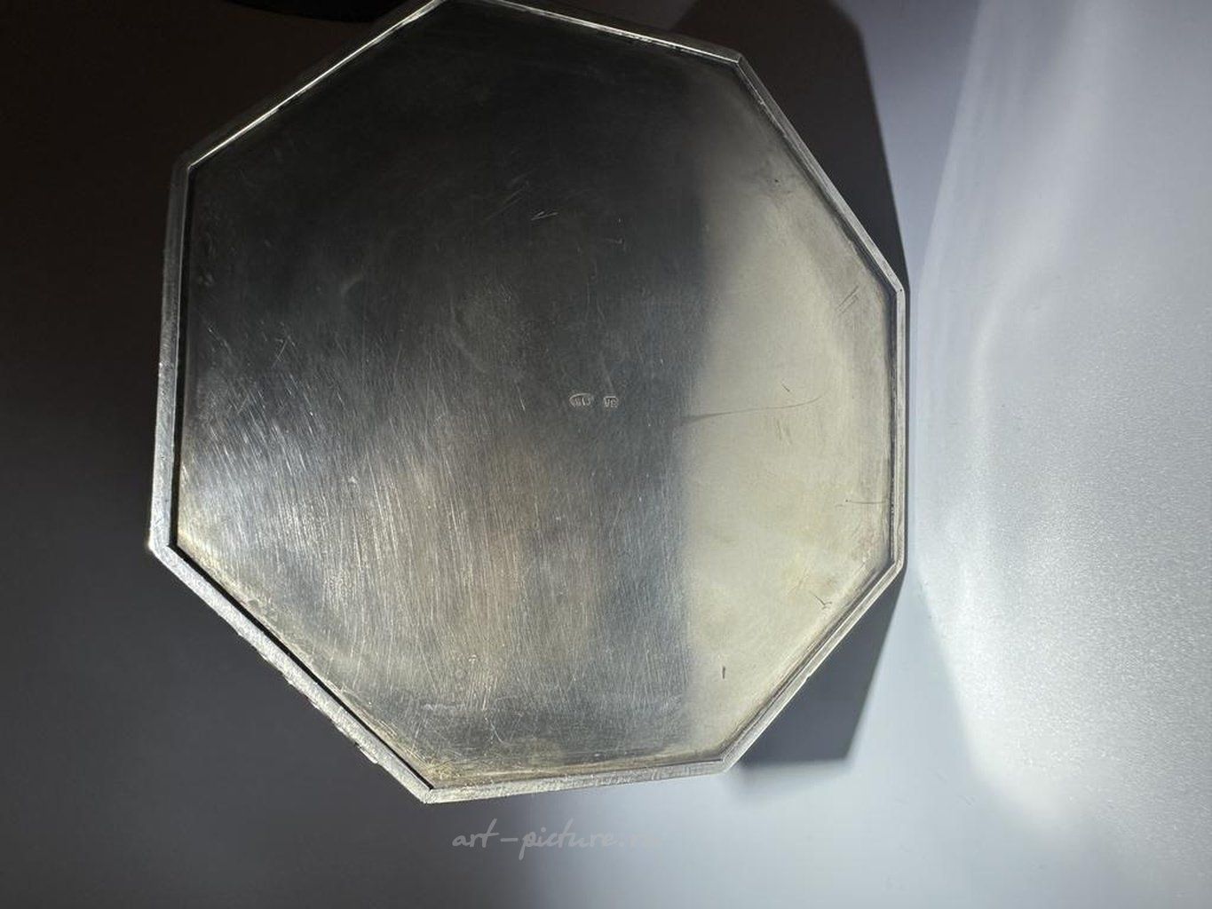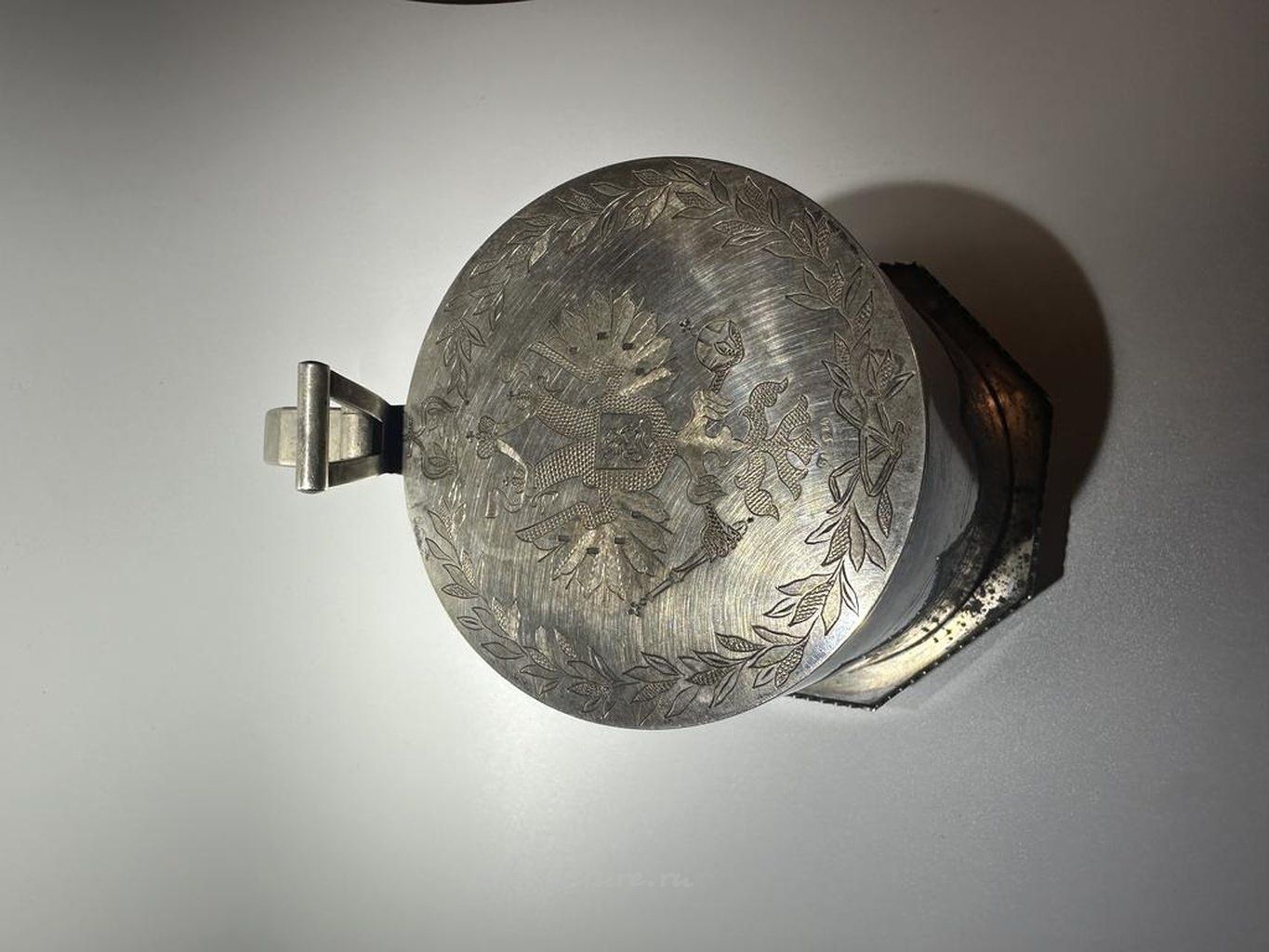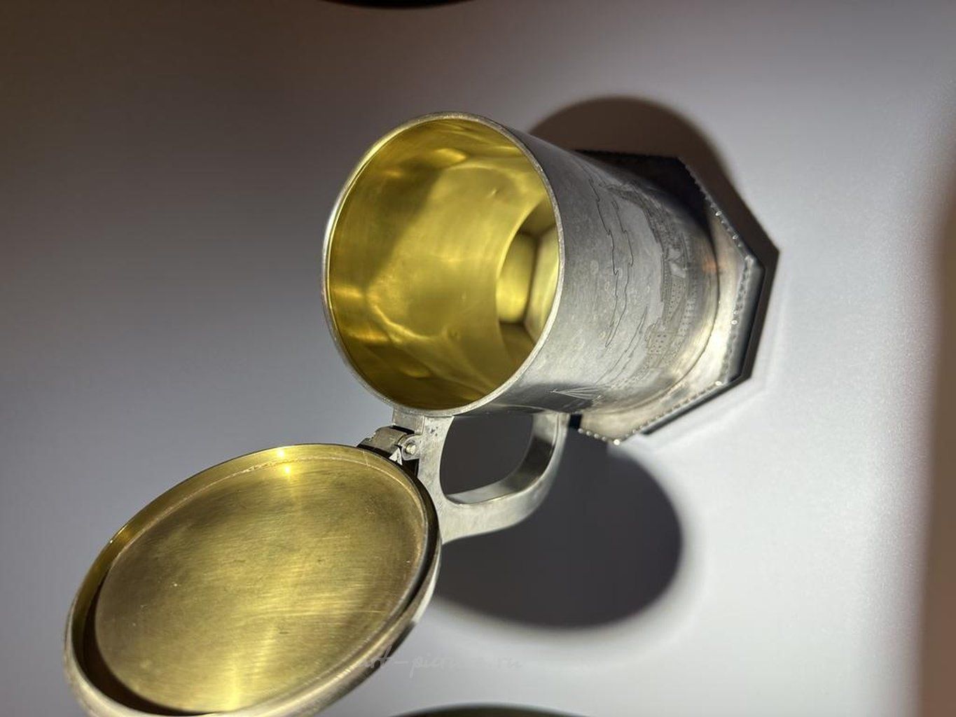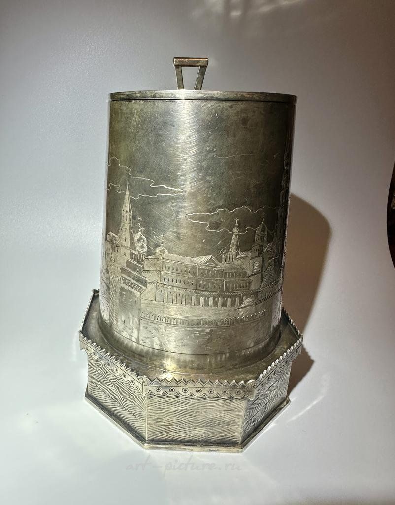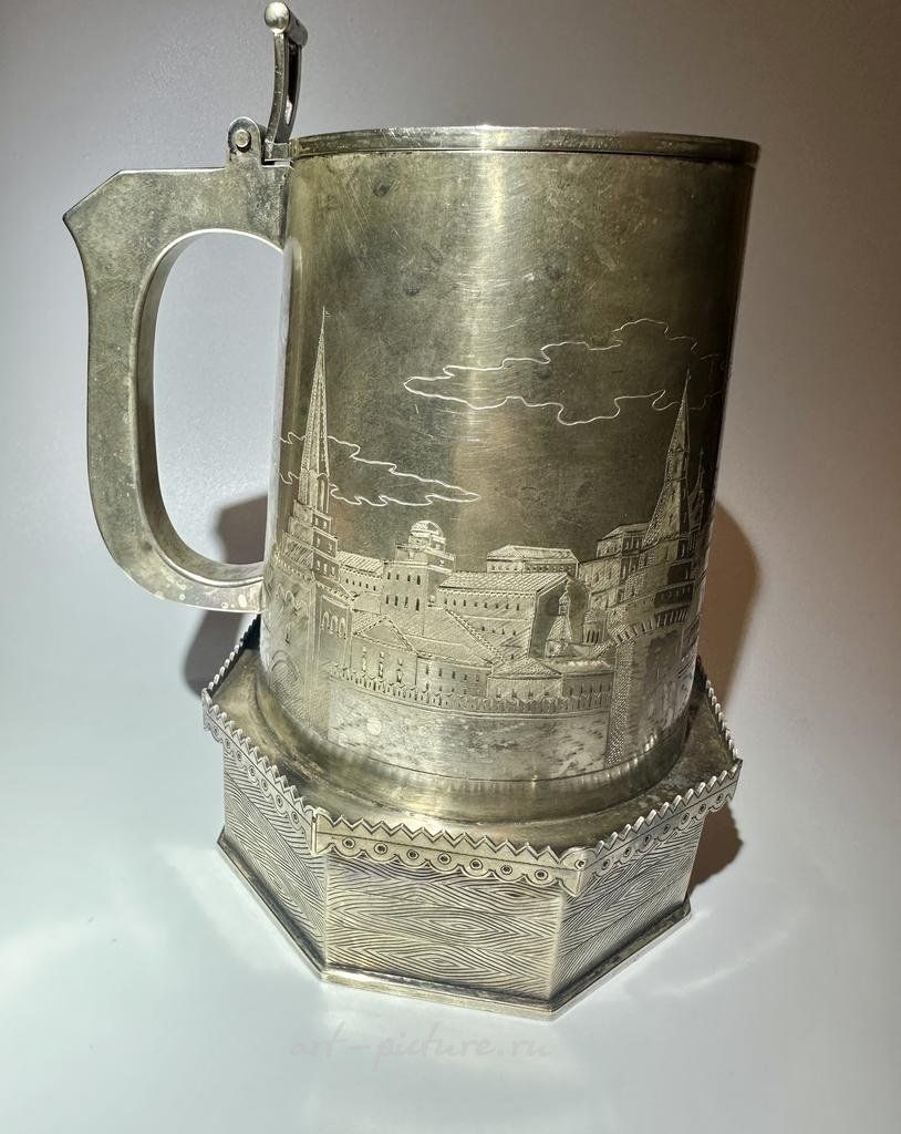 Презентационная кружка с видами Москвы Серебро 84 пробы, резьба, золочение, гравировка, литье, выпиловка. Высота 20,5 см. Москва, 1900-е годы, 5 артель Стиль: Русский Выполненная в русском стиле красивая пивная кружка является довольно массивной и в то же время элегантной. Как и многие другие работы 5 артели, эта кружка украшена историческими видами Москвы. Сверху на крышке в русской манере изображен Российский герб. Кружка снабжена закрепленной на ней откидной крышкой с рычажком на ручке для большого пальца. Внутренняя часть сохранила первозданную позолоту. Данный предмет является прекрасным подарком не только для любителей пива, но и для ценителей русского искусства.