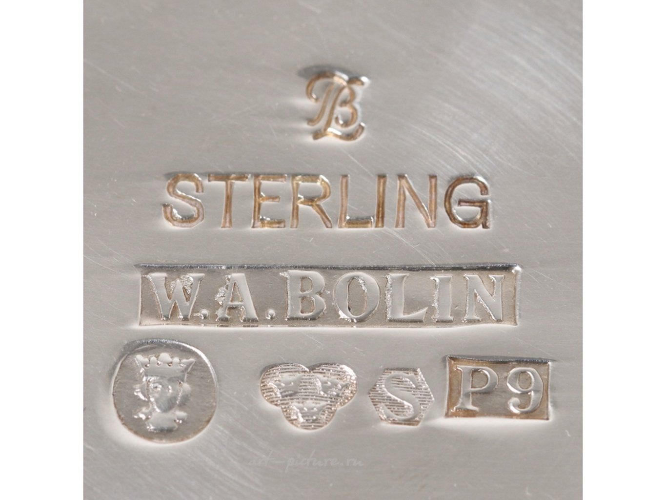 Дизайнерский серебряный стакан W.A. Bolin Дизайнер: Barbro Littmarck (годы жизни: 1918-2008). Швеция, г. Стокгольм, 1965 год, мастерская W.A. Bolin - мастерская наследников великого русского ювелира Вильгельма (Василия) Андреевича Болина из знаменитой династии потомственных придворных поставщиков Российской Империи, иммигрировавших в начале ХХ века в Швецию. Монограмма дизайнера. Высота: 6,5 см, диаметр верха: 6,5 см. Объём: 150 мл. Вес: 102 грамма серебра 925 пробы. Барбро Литтмарк, р. 1918 г. 2008 г. — главный конструктор В.А. Болина с начала работы в 1941 г. до середины 80-х гг. Некоторые из ее самых известных работ включают епископский посох и процессионный крест для Уппсальского собора, а также работы для нескольких других церквей по всей Швеции. Ее работы часто содержали тонкий юмор, забавные и весьма привлекательные нотки. В течение ряда лет она делала небольшие плетеные броши-корзинки из желтого золота с рубиновыми и сапфировыми цветами и эмалевыми листьями. Все 57 различных брошей-корзинок, которые она сделала, были уникальными. Барбро Литтмарк представлена в Стокгольмском национальном музее и в Голдсмит-холле в Лондоне. BARBRO LITTMARCK (1918-2008), an egg-shaped box, W.A Bolin, Stockholm. Barbro Littmarck, b. 1918 d. 2008, was W.A. Bolin's chief designer from the start of her employment in 1941, until the mid 80's. Some of her best known work include the bishop's crosier and processional cross for Uppsala Cathedral, and work for several other churches around Sweden. Her work often contained a subtle humour, an amusing and quite appealing touch. For a number of years, she made small yellow gold woven basket brooches with ruby and sapphire flowers and enamel leaves. The 57 different basket brooches she made were all unique. Barbro Littmarck is represented at the Stockholm National Museum and at the Goldsmith's Hall in London. Designer silver beaker (cup). Designer: Barbro Littmarck (years of life: 1918-2008). Sweden, Stockholm, year 1965, workshop W.A. Bolin. Designer's monogram. Height: 6.5 cm, diameter of the top: 6.5 cm. Volume: 150 ml. Weight: 102 grams of sterling silver 925 fineness.