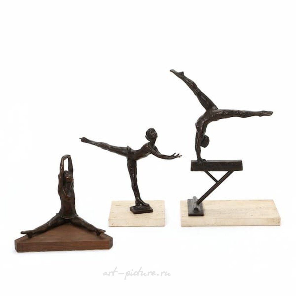 На изображении, которое привлекает взор своей изысканностью и продуманностью, представлены три бронзовые статуэтки, изображающие гимнасток в различных позах, которые в полной мере передают суть и динамику движения, присущие гимнастическим упражнениям. Каждая из фигур, выполненная с большой степенью детализации и художественного мастерства, излучает грацию и элегантность, что является неотъемлемой частью искусства спортивной гимнастики, где симметрия и баланс становятся не только физическими, но и эстетическими категориями.
