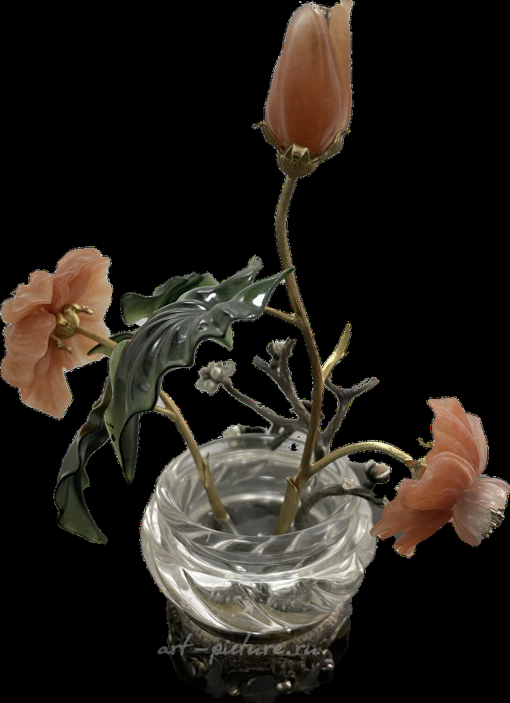 Ювелирная камнерезная композиция "Икебана" из драгоценных металлов и камней; Автор работы: Светлана Седых; Материалы: Золото 585: Серебро 925, 875: жемчуг, бриллианты 3 шт, розовый сапфир, нефрит, сердолик, горный хрусталь; Размеры:15.7 см. Уникальные произведения искусства из натуральных драгоценных и полудрагоценных камей могут стать важным дополнением интерьера, драгоценным подарком, предметом коллекционирования. Сегодня интерес к этому жанру, блистательно представленному в России на рубеже XIX - XX вв. фирмой Карла Фаберже, вновь возродился. Эти работы чрезвычайно трудоемки и сложны в исполнении. Пластическое решение варьируется от миниатюрных лаконичных вещей до сложных композиций с множеством ювелирных деталей. Декоративное богатство цветочных композиций, достигается скрупулезной камнерезной и ювелирной работой, требует участия самых разных мастеров ювелирного дома.