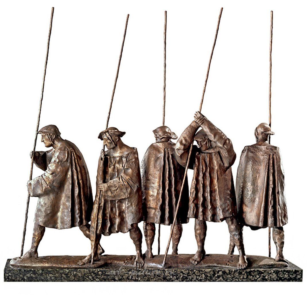 Поступательное движение Дронова происходило сравнительно спокойно и плавно, не смотря на его явное пристрастие к иронии, гротеску и доброму юмору. В отличие от Тугаринова, он менее склонен к содержательным и формальным авантюрам. Например, его «Мудрецы» (1998) и одна из последних работ «Болото» (2008) по своему композиционному строю сравнимы с роденовскими «Гражданами Кале», тем более что конкретной принадлежности к какой-то определенной эпохе в героях Дронова не обнаруживается. «Рыбак», «Старик с хворостом» или «Старый король» – это также общечеловеческие образы на все времена. А «Последний день Помпеи» (1998) и вовсе погружает зрителя в глубокую древность. Причем ни к каким особенным формальным ухищрениям скульптор не прибегает, изображая застывшие в бронзе складки одежды, объемлющие пустоту вместо человеческого тела, напоминая тем самым о трагедии, постигшей итальянский город, засыпанный вулканическим пеплом. Несмотря на отмеченное содержательное пристрастие к вечным темам, Дронов остается нашим современником. Чтобы убедиться в этом, достаточно обратиться к его известной скульптуре, которая в старом каталоге называется «Зимние похороны», а в самом последнем, вышедшем к выставке в галерее «Дом Нащокина», – «Саксофонист». Сутулый пожилой мужичок в шапке-ушанке и валенках держит в руках музыкальный инструмент, который явно противоречит его простецкому виду. Но именно этот контраст и есть сознательная затея скульптора, стремящегося передать драматизм, нелепость и будничность остановленного мгновения, увиденного в той самой нашей российской жизни, где «терзают Шопена лабухи» и никакой сюрреализм не кажется странным. Впрочем, такая прицельная конкретность в искусстве Дронова редкость. Ему ближе скупые пластические формулы, неизменно отличающиеся четкой ритмикой форм: «Робин Гуд», «Девочка на шаре», «Охотник», «Пионер», «Шарманщик», «Конькобежец»... При всей разности тем и образов в этих и близких им работах хорошо различима индивидуальная стилистика и острота наблюдения, а также редкое умение выявить точный жест. Ритмика «Ночных гостей» (1987), «Осьминога» (1993) и «Лебединого озера» (1994) и вовсе сродни черно-белой замедленной киносъемке, завораживающей зрителя. На первый взгляд особняком смотрятся такие работы, как «Колбаса» (1997), «Гирьки» (1998), «Кораблик» (2000), «Скамейка», «Валенки» (обе 2001), «Кнопка» (2002). Но в принципе их появление вполне логично и дело не только в присущем Михаилу мягком юморе. Налицо любовь к ясно выраженной пластической форме, к лапидарному стилю. На последнем, кстати, Дронов чрезмерно не сосредотачивается, постоянно возвращаясь к тому, что принято считать скульптурной классикой. В частности, «Святой Петр» (2001 год – первоначальный малый вариант и 2008 – большая фигура) – яркий пример подобного традиционного подхода. Мощная монументальная фигура сидящего апостола утяжелена крупными складками длиннополой одежды. Но для усугубления монументальности Дронов далеко не всегда прибегает к формальным утяжелениям и увеличению размера. Его миниатюрный «Гиппопотам» (2002), например, ничуть не уступает любым масштабным изваяниям разных лет. Причина этого в том, что у Дронова тяготение к монументальности связано не с размером вещей, а с внутренним ощущением монументального ритма. И есть еще одна любопытная «родовая