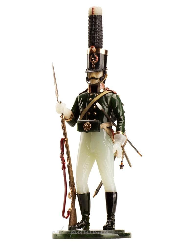Фигура унтер-офицера Киевского гренадерского полка, Шенграбен, 4 ноября 1805 года. Блокированная полихромная скульптура, беление и оксидирование серебра, ручная гравировка и пайка. Зелёный нефрит - мундир, подставка; белый нефрит - панталоны, перчатки, султан, серпентинит - султан, кивер, патронный подсумок, галстук, ранец, сапоги; яшма - погоны, отвороты фалд; родонит - султан, кокарда, воротник, обшлага рукавов; чукотский халцедон - лицо; гагат - волосы, усы, бакенбарды, глаза; золото 585, серебро 925, эмаль, дерево. М 1:10 Зеленый и белый сорта сибирского нефрита, серпентинит, родонит, уральская яшма, чукотский халцедон, гагат, золото, серебро, эмаль, дерево. Окончательная дата создания 25.12.2003 года. Возле австрийской деревни Шенграбен русский арьергард под командованием генерала П.И. Багратиона преградил дорогу наполеоновскому маршалу Мюрату, дав главным силам М.И. Кутузова время и возможность беспрепятственно отойти и соединиться с резервами и союзными войсками. Весь день и всю ночь 4 ноября кипело ожесточенное сражение. 5-ти тысячный русский отряд стоял насмерть, сдерживая натиск 30-ти тысячного неприятельского корпуса. Особенно отличились в деле при Шенграбене Киевский гренадерский и Павлоградский гусарский полки. Выполнив свою задачу, отряд Багратиона сумел уйти от преследования и присоединиться к главным силам русских. Багратион в битве при Шенграбене показал французам, на что способен он, русский генерал, и его солдаты. Из свалки боя князь вывел самую малость израненных, окровавленных людей, и Кутузов, ожидавший полной гибели отряда, сказал ему: «О потерях не спрашиваю: ты жив – и слава Богу!» Унтер-офицер Киевского гренадерского полка. Гренадерский унтер-офицер одет в короткий мундир фрачного типа из темно-зеленого сукна, введенный в 1802 году. Отвороты фалд и погоны красные, скошенный стоячий воротник розового цвета. На груди против концов воротника пришито по шесть медных пуговиц. Обшлага на мундире круглые, приборного сукна, с узким клапаном темно-зеленого цвета и тремя пуговицами. Погоны, застегивающиеся на пуговицы, полагаются на обоих плечах. Фалды мундира находят друг на друга; внизу, на каждой фалде, в месте соединения суконной обшивки, пришито по пуговице. Галстук – с манишкой, из черного сукна. Зимние штаны пошиты из белого сукна, сапоги – смазные, тупоносые, с вырезом на задней стороне голенища. С 1805 года вместо гренадерских и фузелерных шапок были введены шапки из черного сукна высотой 20 см с козырьком и подбородным ремнем из черной лакированной кожи. Над козырьком крепится медная гренада и пуговица, а также черная кокарда с оранжевой каймой. У верхнего края шапки черный султан из конского волоса высотой 49.5 см. По верхнему краю шапки нашит золотой галун, верхняя часть султана белая с красной полоской. Нижний и боковые края воротника унтер-офицера, а также верхние края обшлагов обшиты золотым галуном. Вместо патронной сумы на поясе крепится подсумок. Кроме того, унтер-офицеру полагаются замшевые перчатки и камышовая трость. Ранец круглой формы из черной кожи застегнут на три пряжки. Надет он через левое плечо левым боком вверх. К середине ранца прикреплена водоносная фляжка. Оружие – шпага с тесачным клинком и унтер-офицерское винтовальное ружье образца 1798 года с трехгранным штыком. И 1801 году солдатам были обрезаны букли и
