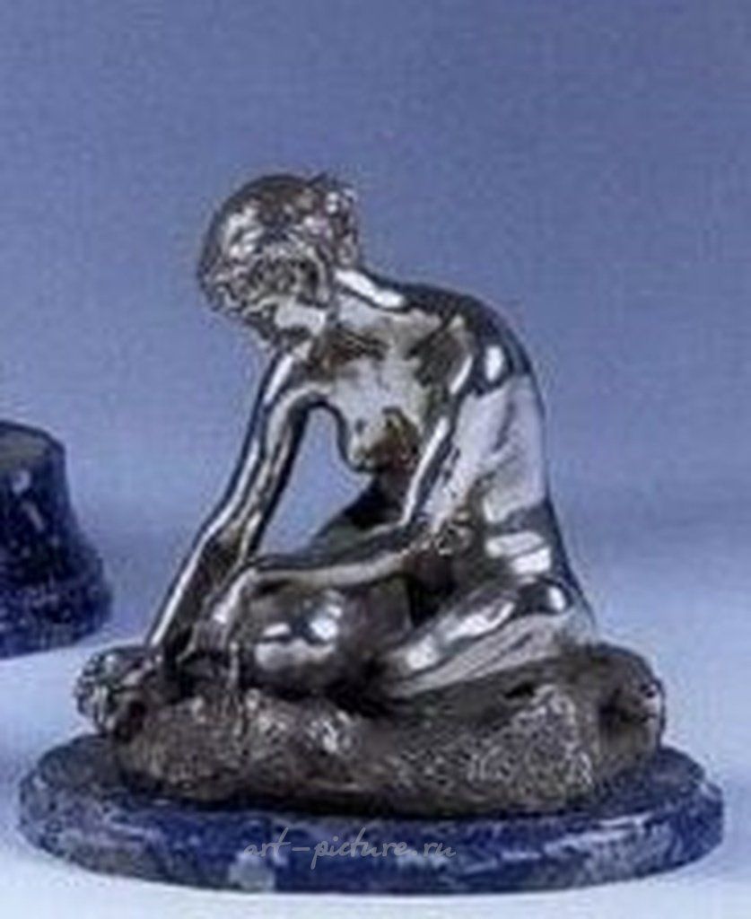 Скульптура серебренная на основании из лазурита - Молодая обнаженная девушка сидит на снопе льна (Jeune fille nue assise sur une gerbe de Lin) Раймон Ривуар Raymond Rivoire Размеры: 10,16 x 12,7 x 10,16 см. Куплена на аукционе: Nov 09, 2000, Auction house Tajan, Paris, Paintings & Sculptures 1820-1920, Lot 40. РИВУАР Леон Раймонд 1884 - 1966 Французский скульптор, родился 21 октября 1884 года в Кюссе и умер 27 сентября 1966 года. Антуан Жозеф Леон Раймонд Ривуар родился в буржуазной семье. Его отец, Пьер Бартелеми Артур Ривуар, владел землями в Каннах, а его дед по отцовской линии возглавлял подразделение в префектуре Рона. Ученик Жана-Антуана Энжальбера в Школе изящных искусств в Париже, он дебютировал на Салоне французских художников в 1905 году. Он получил серебряную медаль в 1921 году и золотую медаль в 1929 году. Он выставляется во Франции и за рубежом : в Лондоне, Риме и Буэнос-Айресе. Для лайнера “Нормандия” он создал бронзовую скульптуру, изображающую Нептуна в колеснице, запряженной гиппокампами, которая исчезла во время корабельного пожара в Нью-Йорке в 1942 году. Копия этой скульптуры до сих пор украшает фонтан в Каннах. Еще одно из его главных произведений – Диана с борзой, также известная как Артемида. Эта скульптура находилась в салоне лайнера “Атлантика”, где также произошел пожар. Его скульптуры найти в нескольких музеях (Музей Лувра, Музей Ньюарка (Нью-Джерси, США), а также в Музее Кассе, в котором находятся несколько его произведений. Он был назначен рыцарем Почетного легиона 29 декабря 1932 года и награжден 13 января 1933 года Жаном Готье, заместителем директора Национальной консерватории искусств и ремесел. В конце своей жизни он жил в доме престарелых для художников. Скульптура изготовлена на Литейный завод Клода Вальсуани (Cire C.Valsuani Perdue) (литье по выплавляемым моделям). THE CLAUDE VALSUANI FOUNDRY (lost wax process). Скульптуры Вальсуани считаются редкими и практически никогда не появляются на рынке произведений искусства. Обычно они продаются по более высокой цене, чем скульптуры других литейных заводов Франции. Литейный завод Вальсуани VALSUANI — это французский художественный литейный завод по производству бронзовых изделий, расположенный в Шеврёзе (в парижском регионе). Основанный в 1899 году в Шатийоне (недалеко от Парижа) Клодом Вальсуани, завод обосновался в 1905 году по адресу: улица де Плант, 74, Париж. Вальсуани быстро приобрел определенную известность благодаря своему техническому мастерству и совершенству своего производства литья по выплавляемым моделям. Он особенно известен красотой своих патин, одна из которых, самая известная, называется «Черный Вальсуани». После его смерти семейное дело перешло к его сыну Марселю, который затем продал его швейцарской компании. Известный качеством своих изделий, изготовленных методом литья по выплавляемым моделям, литейный завод Вальсуани сотрудничал со многими великими художниками, включая Родена, Бурделя, Ренуара, Пикассо, Матисса, Ривуара, Дега, Гогена, Помпона, Карпо, Домье, Деспио, Трубецкого и Дали. Sculptor Rivoire Raymond Léon 1884 - 1966 Raymond Léon Rivoire, born October 21, 1884 in Cusset and died September 27, 1966, was a French sculptor. Antoine Joseph Léon Raymond Rivoire was born into a bourgeois family, his father, Pierre Barthélemy Arthur Rivoire, was a proprietor in Cannes and his paternal grandfather was head of division at the Rhône prefecture. As one of Injalbert’s students at the Beaux-Arts in Paris, Raymond exhibited at the Salon of French artists in 1905. He received a silver medal in 1921 and a gold in 1929. He exhibited in France and abroad in London, Rome and Buenos Aires. For the SS Normandie ocean liner, he produced a bronze cast representing Neptune pul