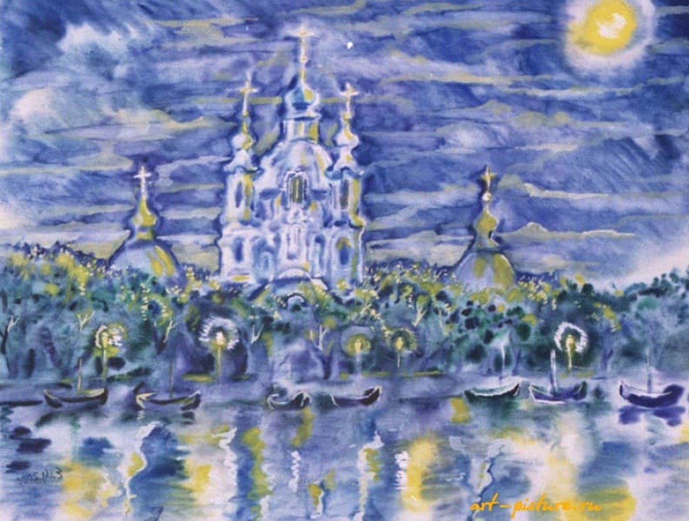 Какое потрясающее сочетание цветов! Ночь на этой картине будто дышит, а собор освещен так, что на него хочется смотреть бесконечно. Каждая деталь словно рассказывает свою историю — уходит в вечность вместе с брызгами лунного света на воде.