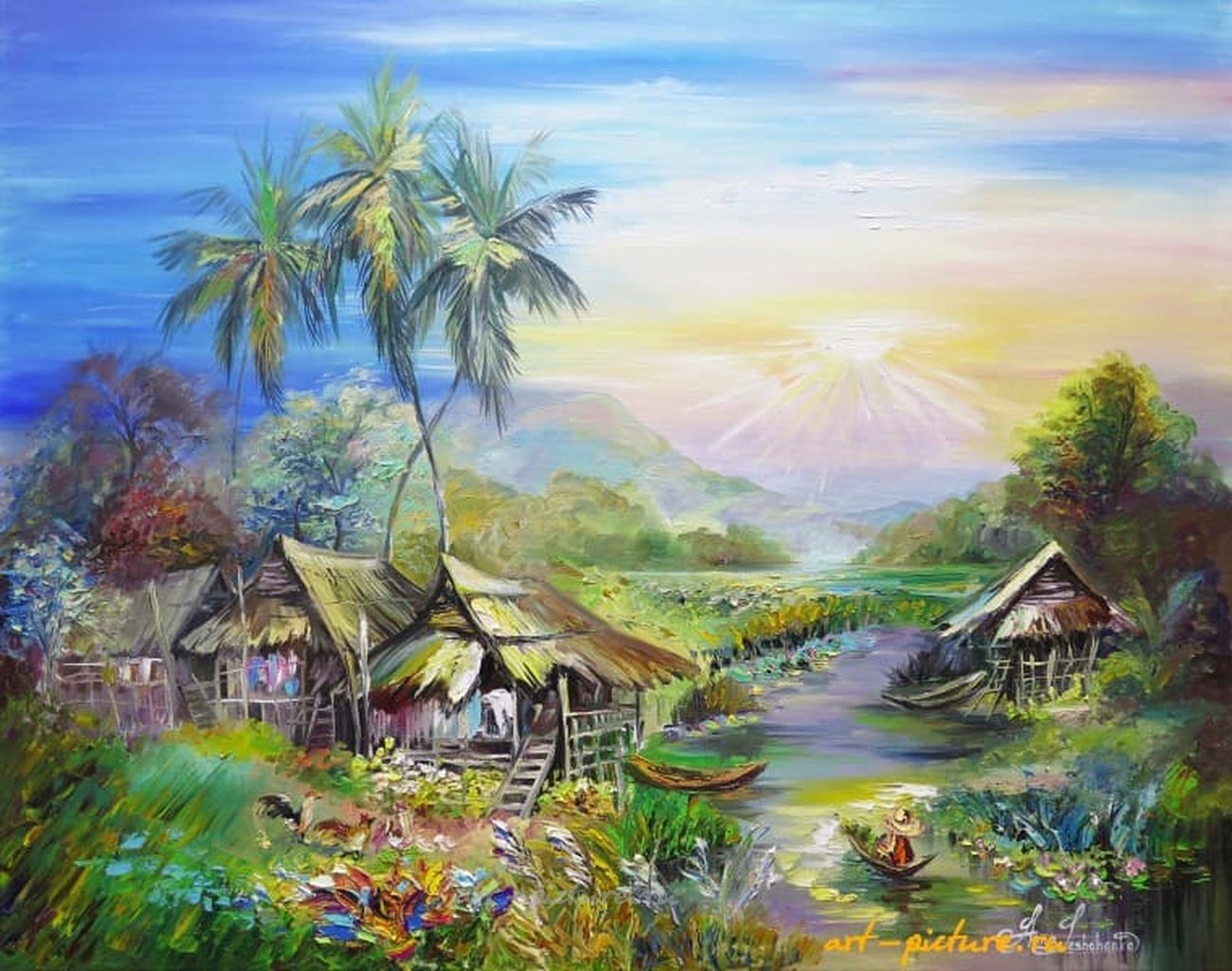 Какой чудесный уголок природы! Яркие цвета и спокойствие реки передают невероятное ощущение гармонии и умиротворения. Пейзаж буквально притягивает к себе, хочется ощутить тот свежий воздух и покой, наслаждаясь красотой тропического мира.