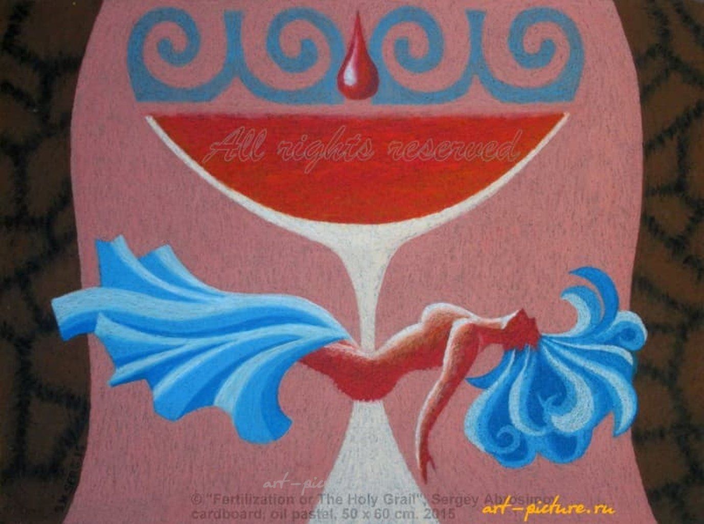 Как же удачно переплетаются цвета и символы в этой работе! Кубок с красной жидкостью и капля, навевающая вопросы о жизни и смерти, заставляют задуматься о глубоком смысле. А длинные волосы фигуры словно уносят нас в мир мечты, создавая завораживающий контраст с центром композиции.