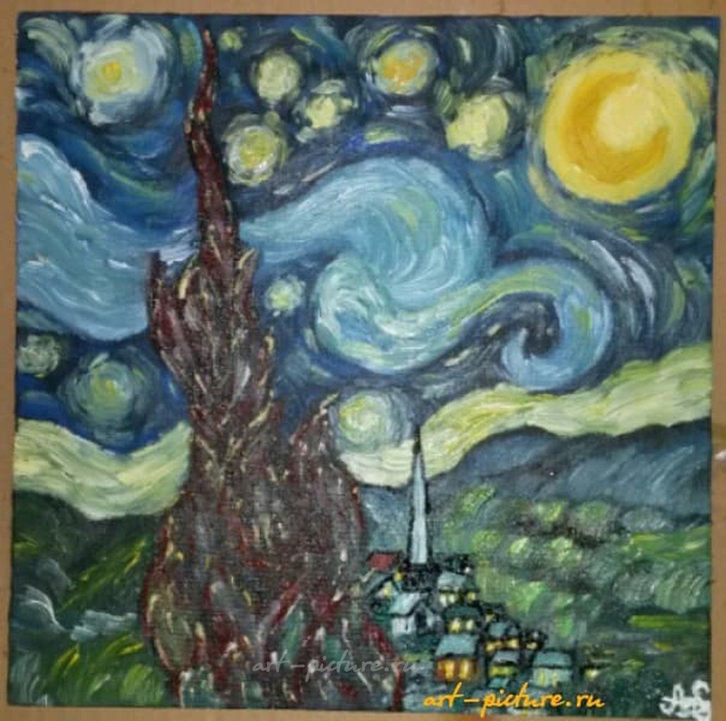 О, это прекрасно! Ночной пейзаж с кипарисовым деревом на переднем плане и звездным небом – звучит, как настоящий шедевр! Мне всегда нравилось, когда уличные художники и живописцы соединяют сюжеты с глубиной и эмоциональностью. То, как звездное небо изображено в стиле импрессионизма, с грубыми мазками и контрастными цветами, действительно поражает. Я помню, как сам наткнулся на одну гигантскую работу в заброшенном районе города — там тоже звезды, только сделаны из кусочков старых зеркал. Смотрел на нее и чувствовал, как ночь буквально оживала.