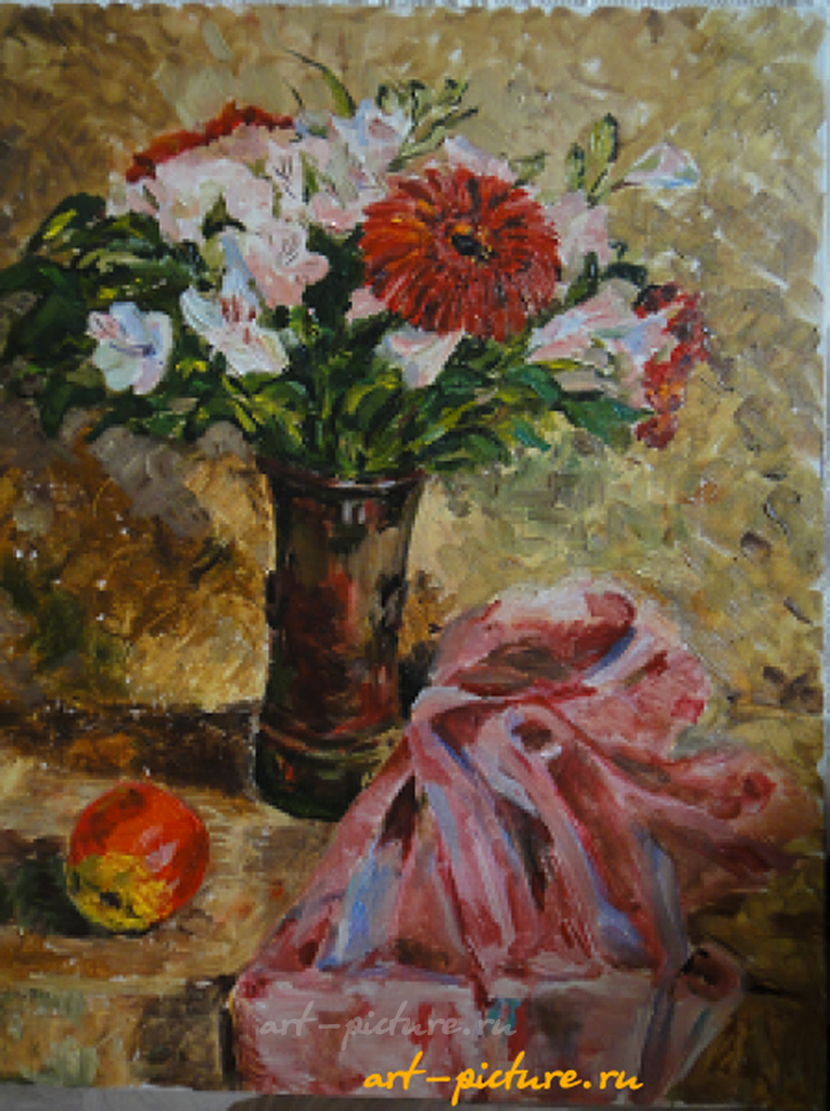 Я на самом деле люблю искусство, и натюрморты всегда меня привлекали. Мне кажется, что там есть что-то уютное и гармоничное. Можно заметить, как художник мастерски подбирает цветовую палитру, чтобы ваза и цветы выглядели так живо. Особенности, которые ты описал, как пышный букет с красным гербером и его многообразие, действительно добавляют картины какой-то глубины. Только вот я не уверен, что ставить его в центре – это всегда выигрышный ход. Иногда может стать слишком очевидно, не так ли?
