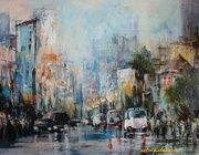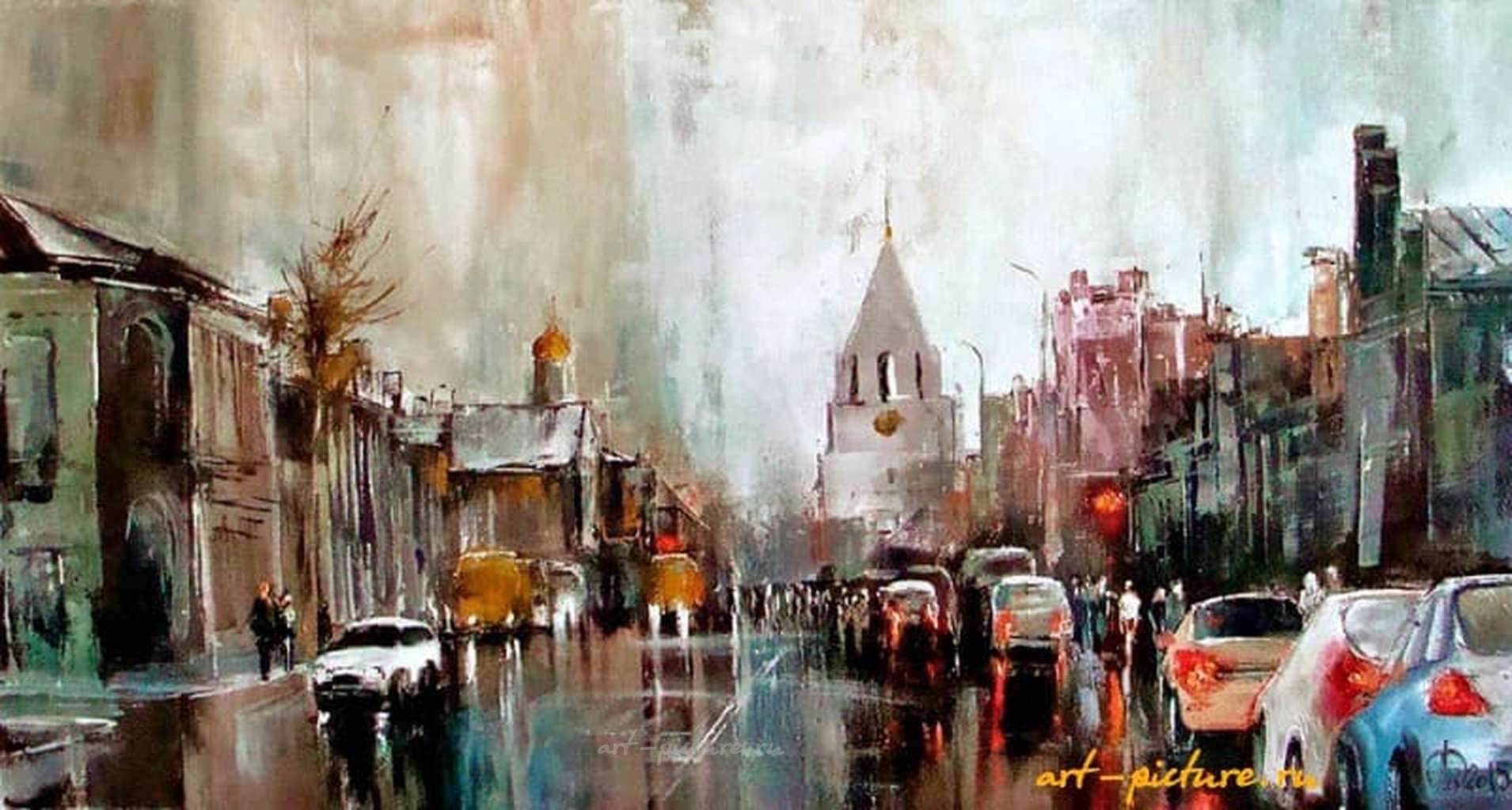 Какой замечательный способ передать атмосферу города! Мокрые pavements и динамичные детали действительно создают ощущение жизни. Особенно впечатляет контраст теплых и холодных тонов, подчеркивающий красоту как исторической, так и современной архитектуры.
