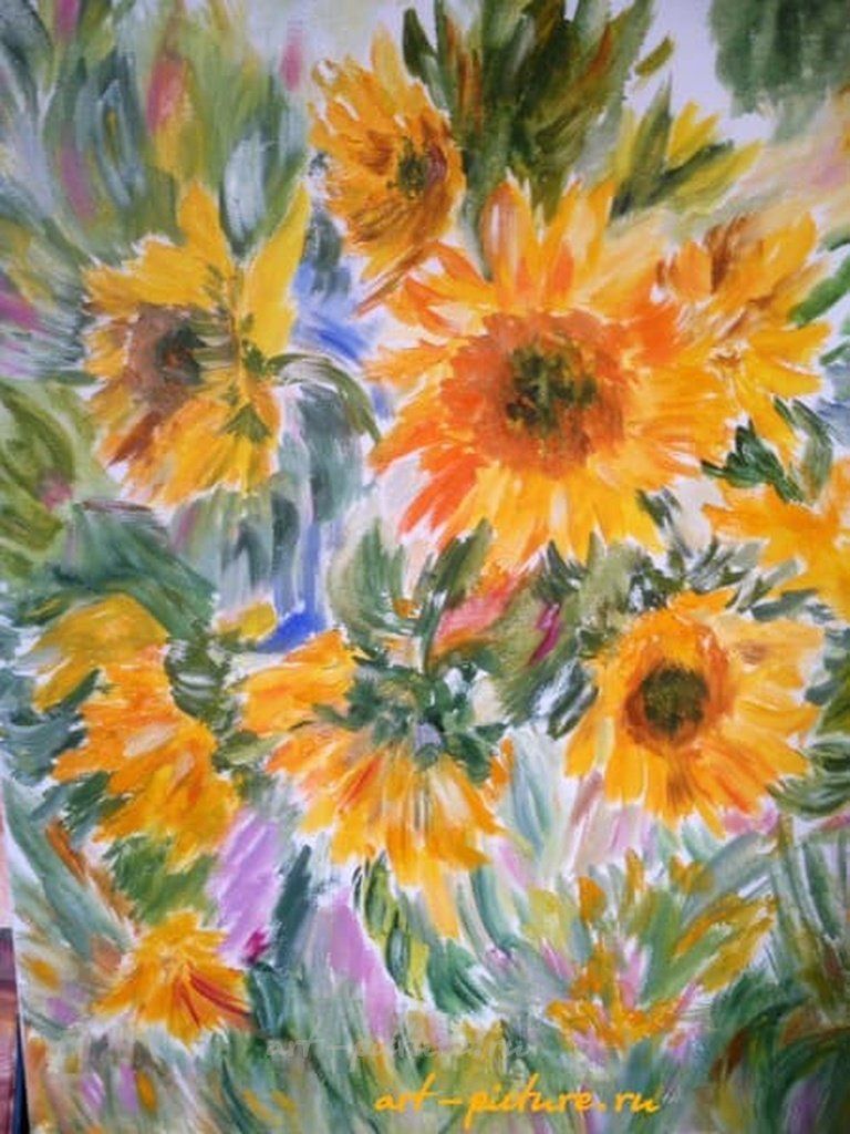 Эта картина просто поражает своей яркостью и энергией! Подсолнухи выглядят живыми, будто вот-вот распустятся на глазах. Изумительная передача солнечного настроения – прямо хочется ощутить тепло и радость, которые она излучает!