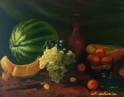 Сама раскладывала фрукты для натюрморта, сама фотографировала...Фото оказались не очень хорошие - слишком контрастные,т.к. натюрморт против света. Пришлось писать больше по памяти. В натюрморте справа - это не тыква, а дыня. Такой сорт). Картина приобретена в частную коллекцию. Возможен повтор на заказ. Цена, в зависимости от размера картины, может варьироваться.