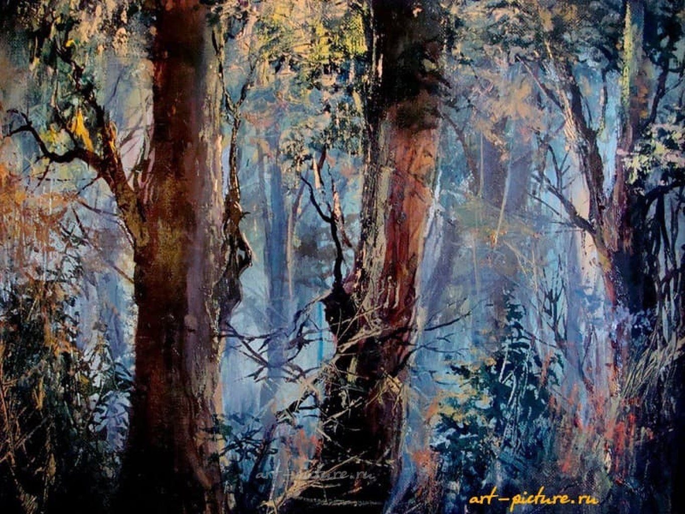 Как же прекрасно ощущается спокойствие и таинственность этого лесного пейзажа! Насыщенные оттенки синего и зелёного действительно создают эффект погружения в природу, а размытие контуров добавляет загадки. Это произведение вызывает желание заблудиться среди деревьев и насладиться гармонией природы.