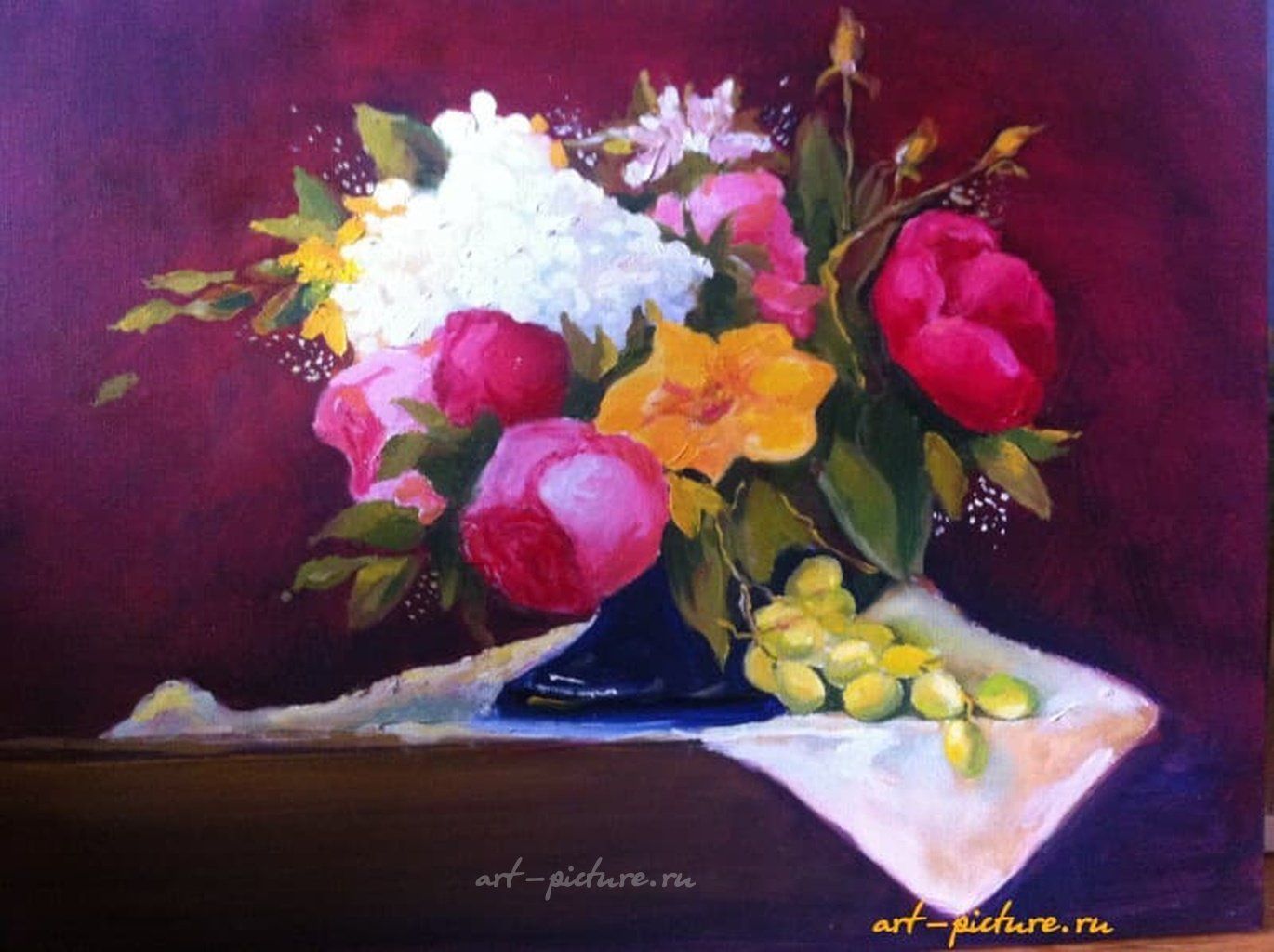 Какой потрясающий натюрморт! Контраст тёмно-бордового фона и ярких цветов просто завораживает. А виноград на скатерти добавляет ощущение свежести и уюта в эту классическую композицию.