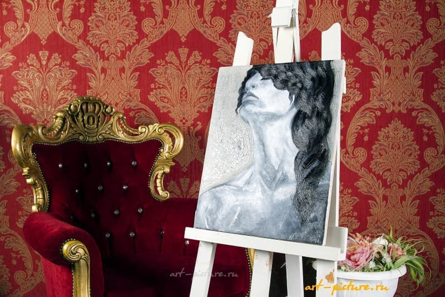 Какой великолепный зал! Потрясающе, как контраст черно-белого портрета женщины сочетает с роскошью кресла и яркими обоями. Эта атмосфера роскоши и изысканности создает идеальное пространство для наслаждения искусством!