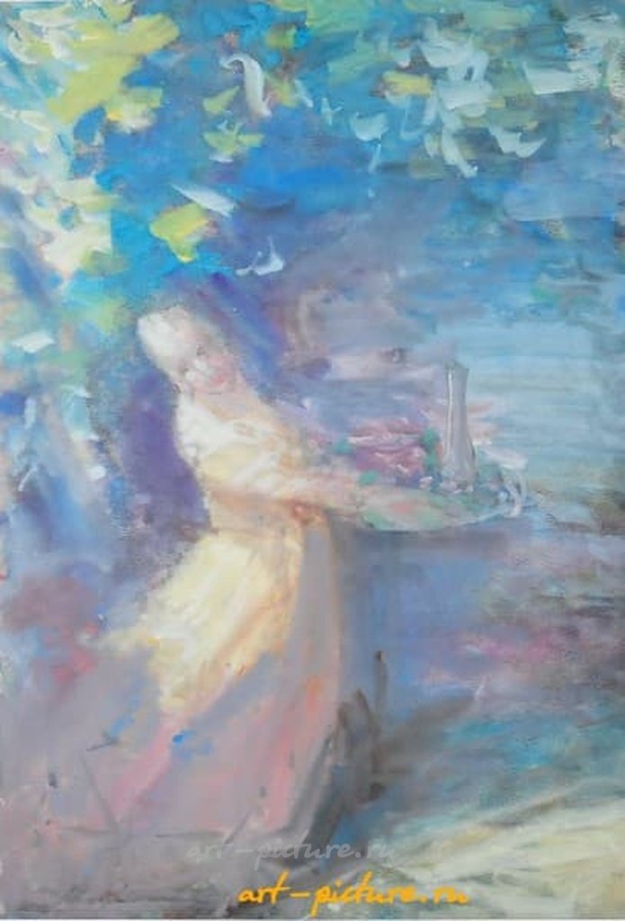 Как же прекрасно, когда искусство способно передать такие тонкие эмоции! Эта мягкая палитра и движение фигуры словно обнимают зрителя, создавая атмосферу уюта и спокойствия. Природа вокруг лишь усиливает это ощущение, придавая картине ещё больше живости и гармонии.