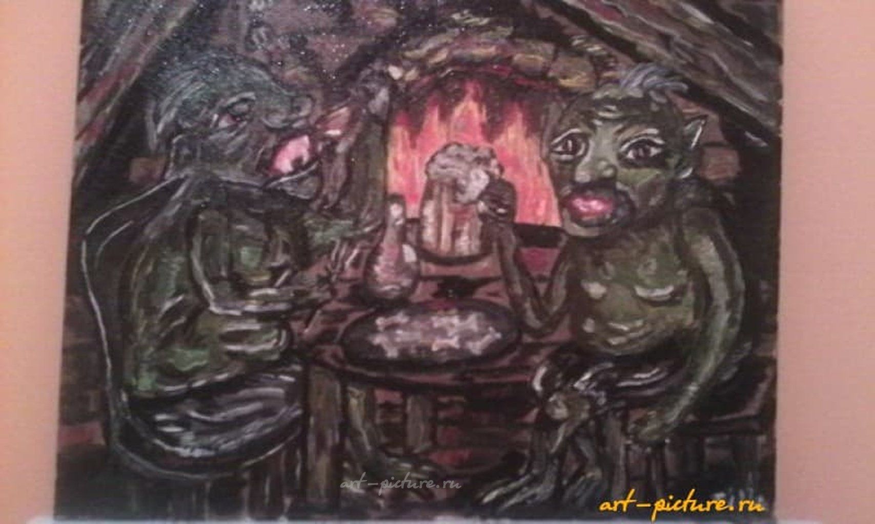 Какое завораживающее зрелище! Эти зеленые существа выглядят почти живыми, а уютный камин на фоне создает ощущение сказочной дружбы и тепла. С такими деталями, как большие глаза и пылающий огонь, хочется погрузиться в их мир и услышать их истории.
