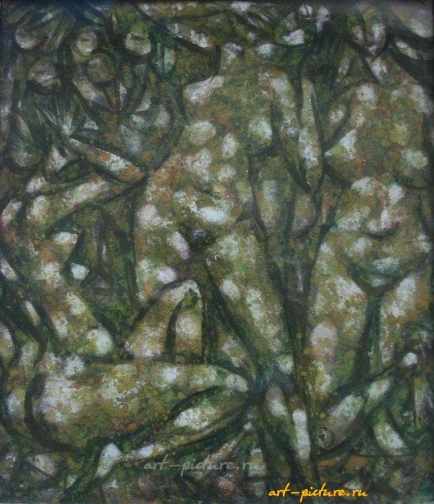 Данная картина, излучающая мощь современного искусства, к которой я обращаюсь с величайшим восхищением, представляет собой интереснейший синтез абстрактной композиции и фигуративного изображения, пленяющего зрителя с первого взгляда. Обнаженные человеческие тела, изображенные в формате абстракционизма, кажутся не просто предметами изображения, но и динамично переплетающимися существами, двигающимися в некоем потоке жизни. Настоящая красота этой работы заключается в том, как художник использует техники, напоминающие пуантилизм — наполняя картину множеством мелких цветовых пятен, он создает уникальную гамму, которая оживляет холст и дает возможность каждому зрителю находить в произведении что-то глубоко личное.