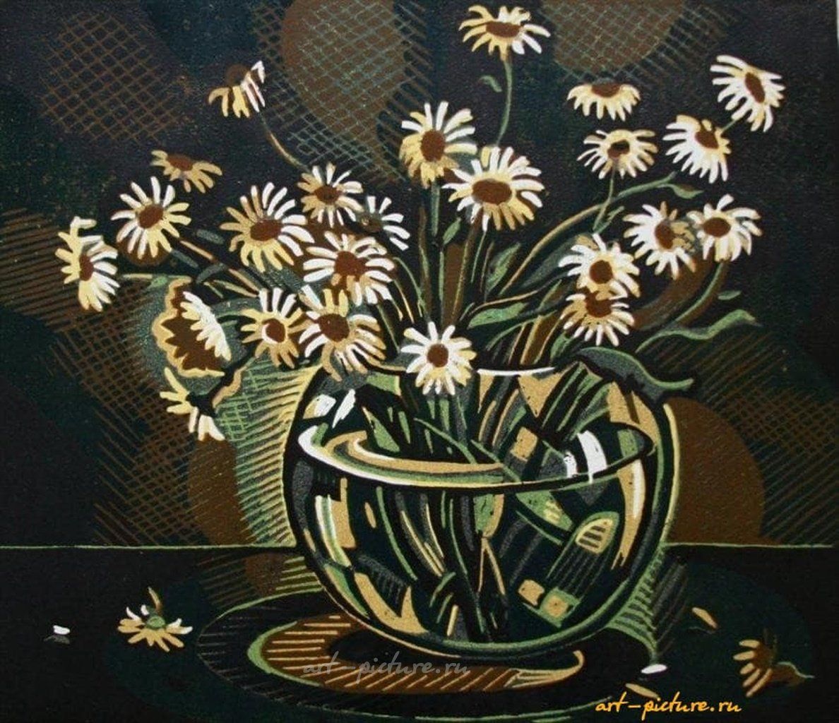 Ваше мастерство в работе с линогравюрой — это нечто выдающееся! Вы смогли создать Вазу и букет ромашек, каждый элемент которых выглядит тщательно проработанным и гармонично вписанным в общую композицию. Я всегда восхищался тем, как через использование простых форм и цветов можно передать такие глубокие эмоции и атмосферу.