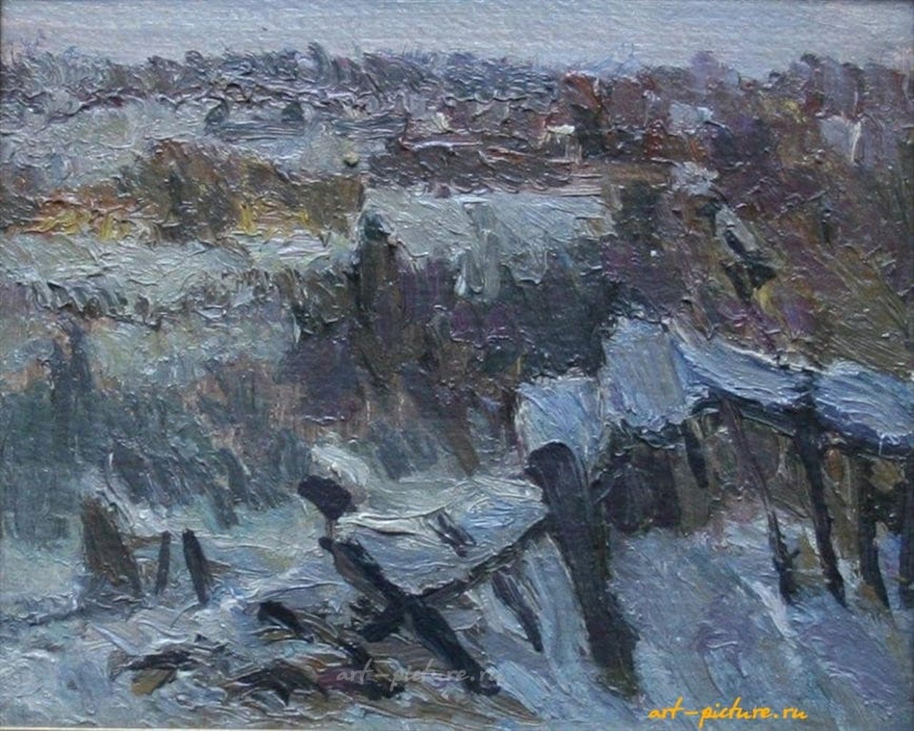 Рассматривая представленный вами зимний пейзаж, можно заметить, что он выполнен с величайшим вниманием к деталям — и это, безусловно, заслуга Ольги Чередовой. Сочетание холодных синих и серых оттенков, которые, как всегда, обрамляют зимний пейзаж, создает атмосферу тишины и покоя, трансформируя каждый элемент картины в живую часть общего сюжета. Я также разделяю ваше восхищение тем, как пастозная текстура мазков передает ощущение воздуха, напоенного холодом, и предоставляет зрителю возможность ощутить себя частью этой холодной, но поразительно красивой зимней идиллии.