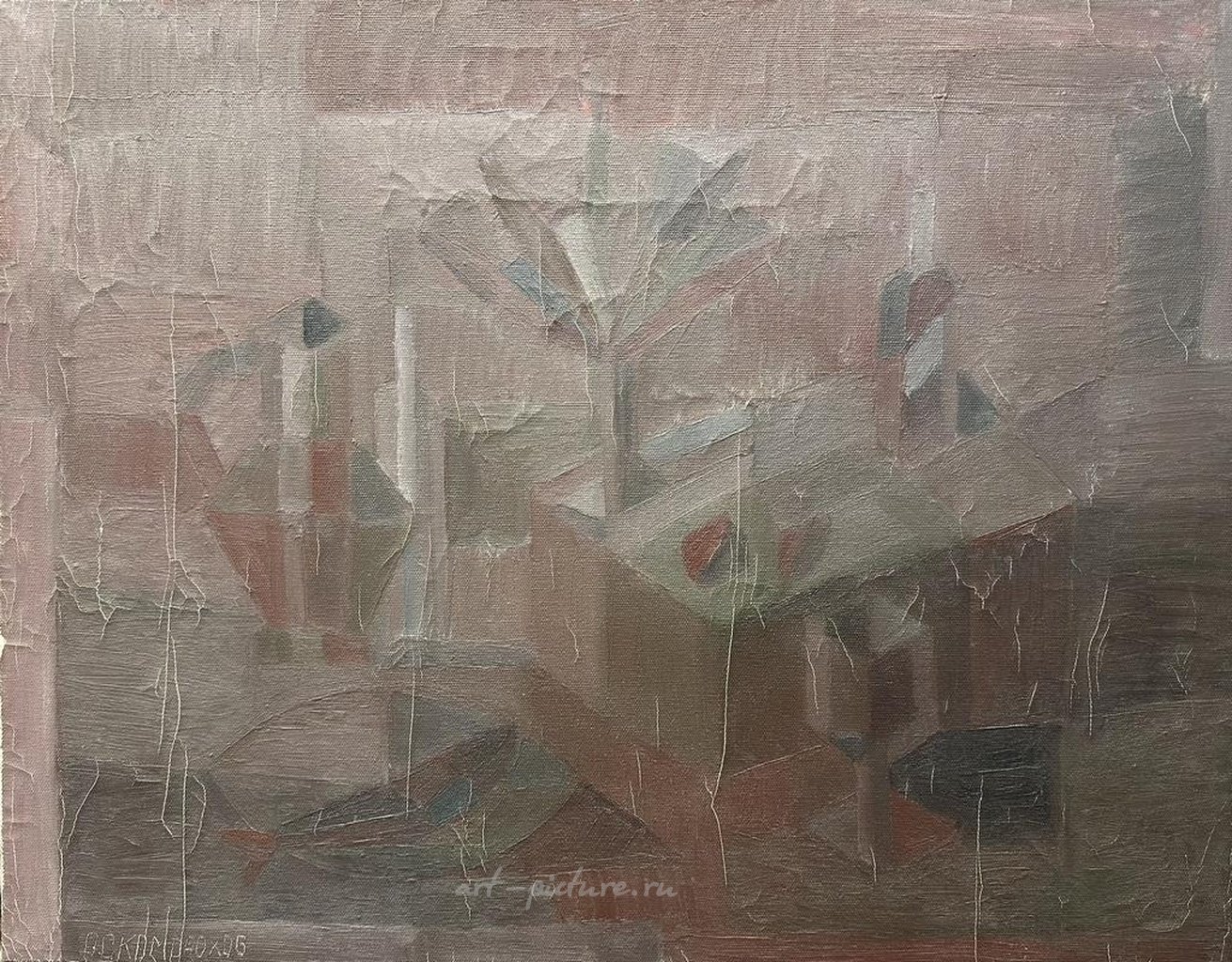 Эта работа в абстрактном стиле привлекает внимание своей текстурой и игрой форм. Геометрические фигуры, которые напоминают натюрморт, создают интересный визуальный опыт. Приглушенные оттенки серого, розового и коричневого создают атмосферу спокойствия и умиротворения, что может затронуть эмоциональную струну зрителей.