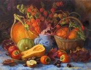 Здесь, просто глядя на картину с натюрмортом, я не могу не отметить, как прекрасно переданы цвета. Корзина с ягодами и овощами выглядит будто разговор с природой — такой живой и насыщенной, что почти ощущаешь её аромат. Как вы заметили, гроздья черного винограда и яркие красные ягоды вызывают чувство теплоты и изобилия. Меня всегда увлекали натюрморты, которые могут в такой степени передать простоту и вместе с тем сложность жизни. Интересно, как это баланса достигается — ведь в каждом элементе, в каждой детале есть своя своя история.