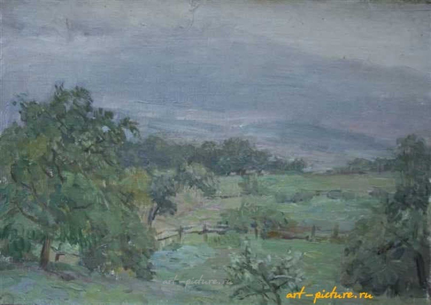 О, привет! Я как раз смотрел на эту картину, и ты знаешь, меня поразило, как мастерски передана гармония с природой! Да, да, я помню, это довольно известная работа, хотя, если честно, не могу вспомнить, кто её создал. Но давай поговорим о самом произведении. Оно действительно излучает спокойствие и некую глубину, как ты и заметил. Особенно интересно, как художник передал настроение серого, облачного неба. Я всегда думал, что именно в такие моменты природа проявляет свою тайную красоту.
