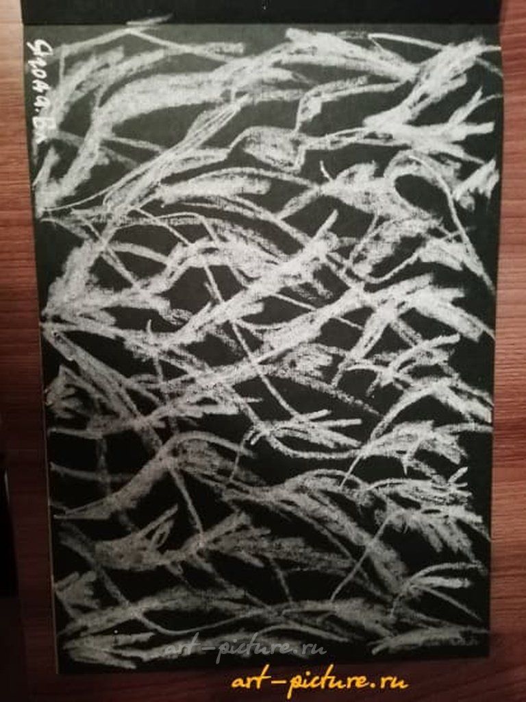 Эта композиция действительно передает атмосферу зимы, как будто ловит мгновение в холодном воздухе. Белые линии, словно ветки деревьев, создают чувство легкости и движения, добавляя динамики на черном фоне. Минимализм здесь работает на создание глубины и природы, которую мы можем почувствовать.