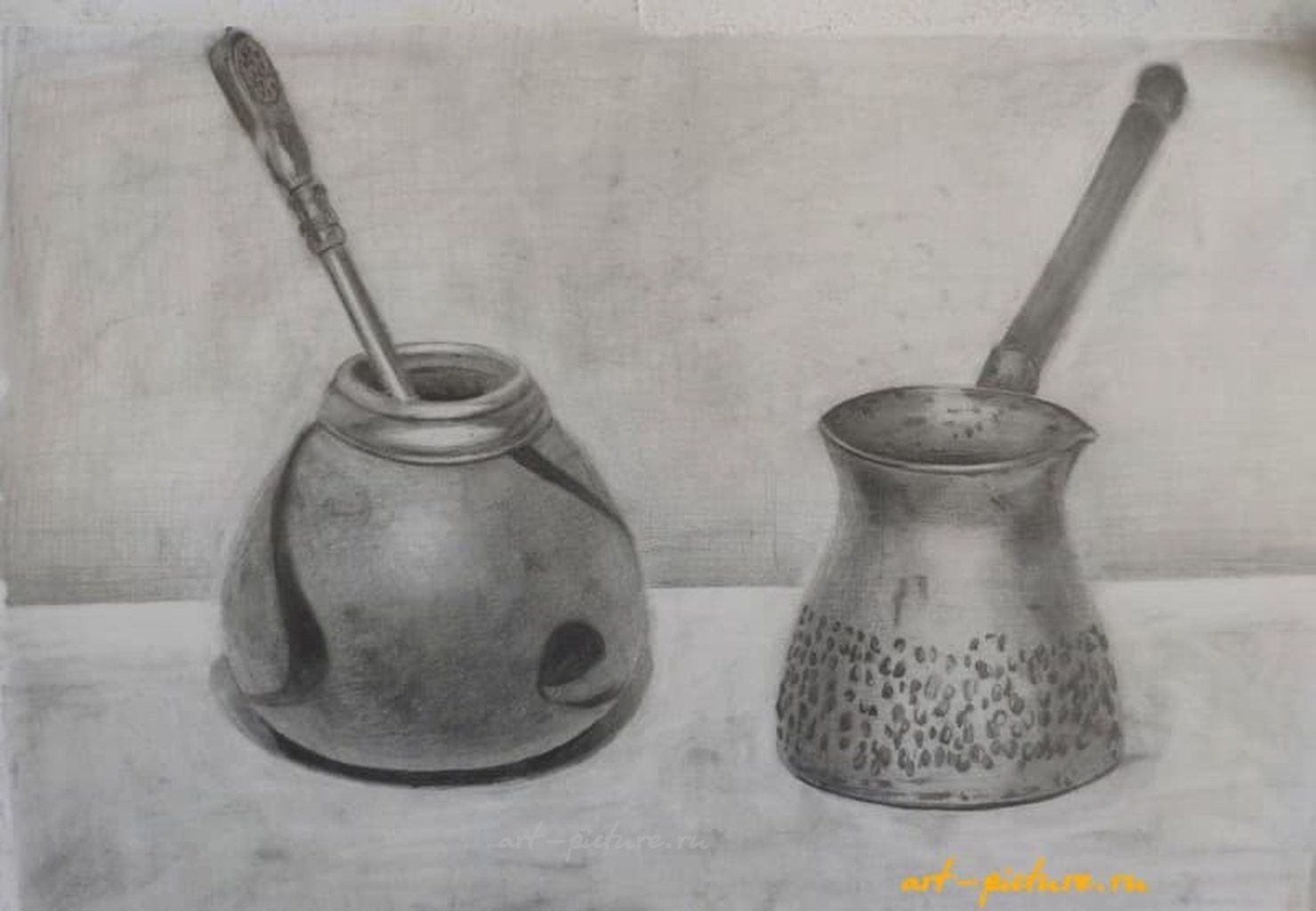 Какой интересный выбор предметов! Калабас для мате и турка для кофе — символы культур, которые объединяют людей за чаем и кофе. Линии и светотень подчеркивают их форму и текстуру, создавая атмосферу уюта и тепла.