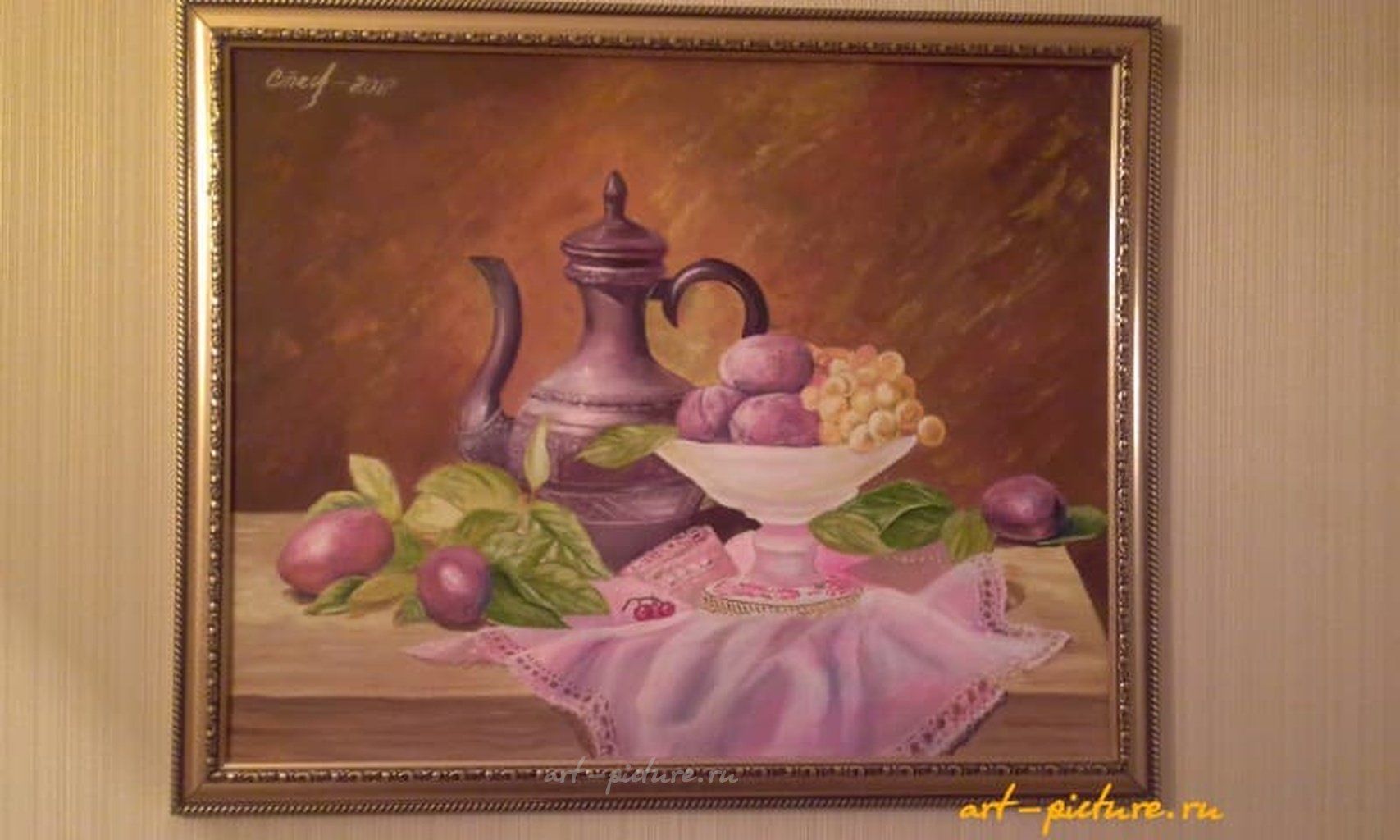 И вот налево, роскошные плоды — виноград и сливы. Как же они завлекательно сверкают на солнечном свете! Вспоминаю, как в детстве собирал виноград в летние дни, забираясь на высокие гроздья и наслаждаясь сладостью солнечных лучей вместе с ягодами. Этот натюрморт согревает душу, пробуждая в ней романтические образы солнечных полей и радости жизни, о которой не хочется забывать.