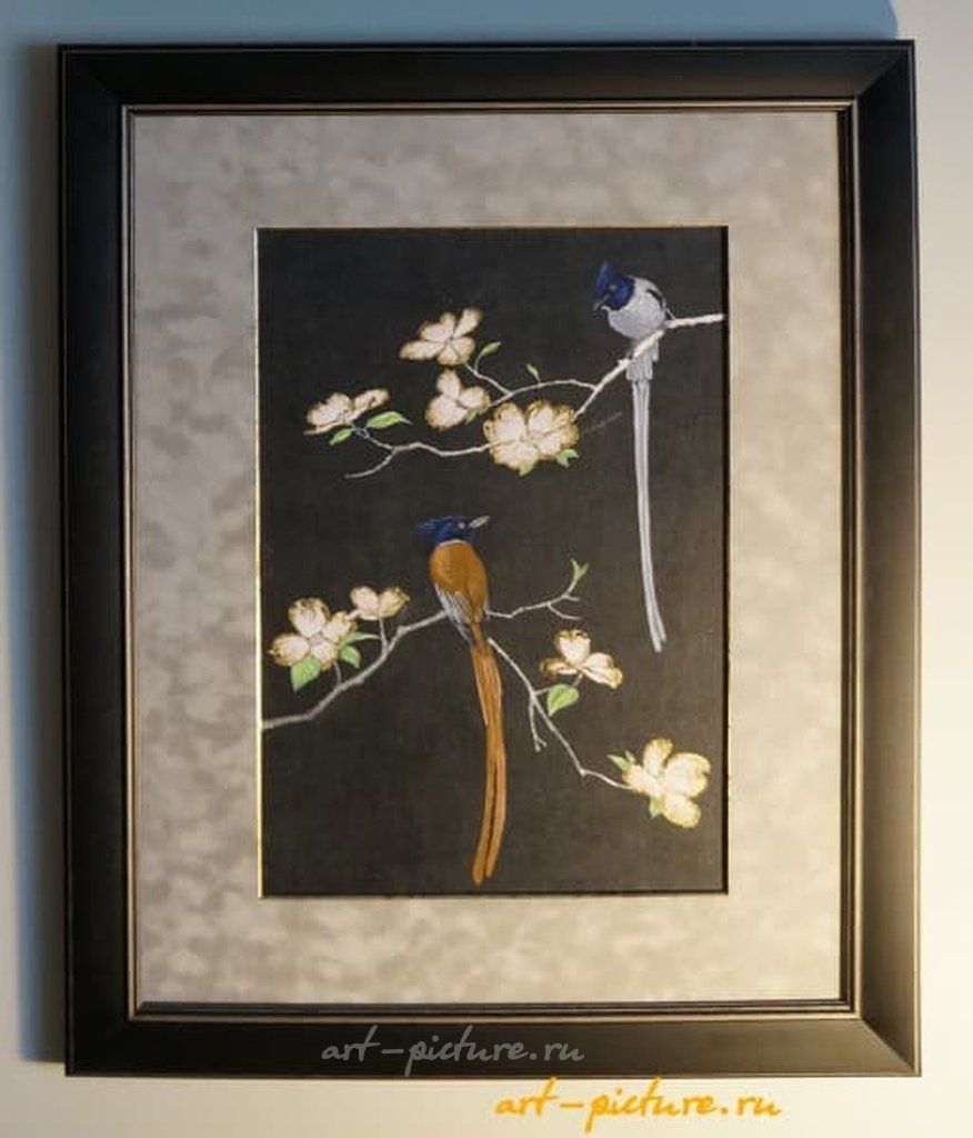 Как же великолепно смотрятся эти птицы на таком фоне! Черная рама действительно подчеркивает их красоту, а цветущие ветви добавляют ощущение весеннего настроения. Элементы композиции так гармонично переплетаются, создавая атмосферу спокойствия и умиротворения.