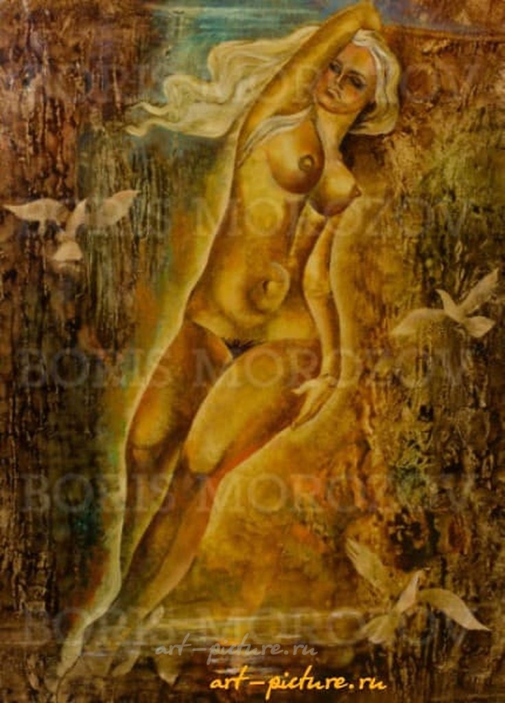 Какая невероятная картина! Обнажённая женщина, словно парящая в воздухе, передаёт чувство свободы и гармонии с природой. А голуби вокруг добавляют атмосферу лёгкости и умиротворения, всё вместе словно уносит в мечту.